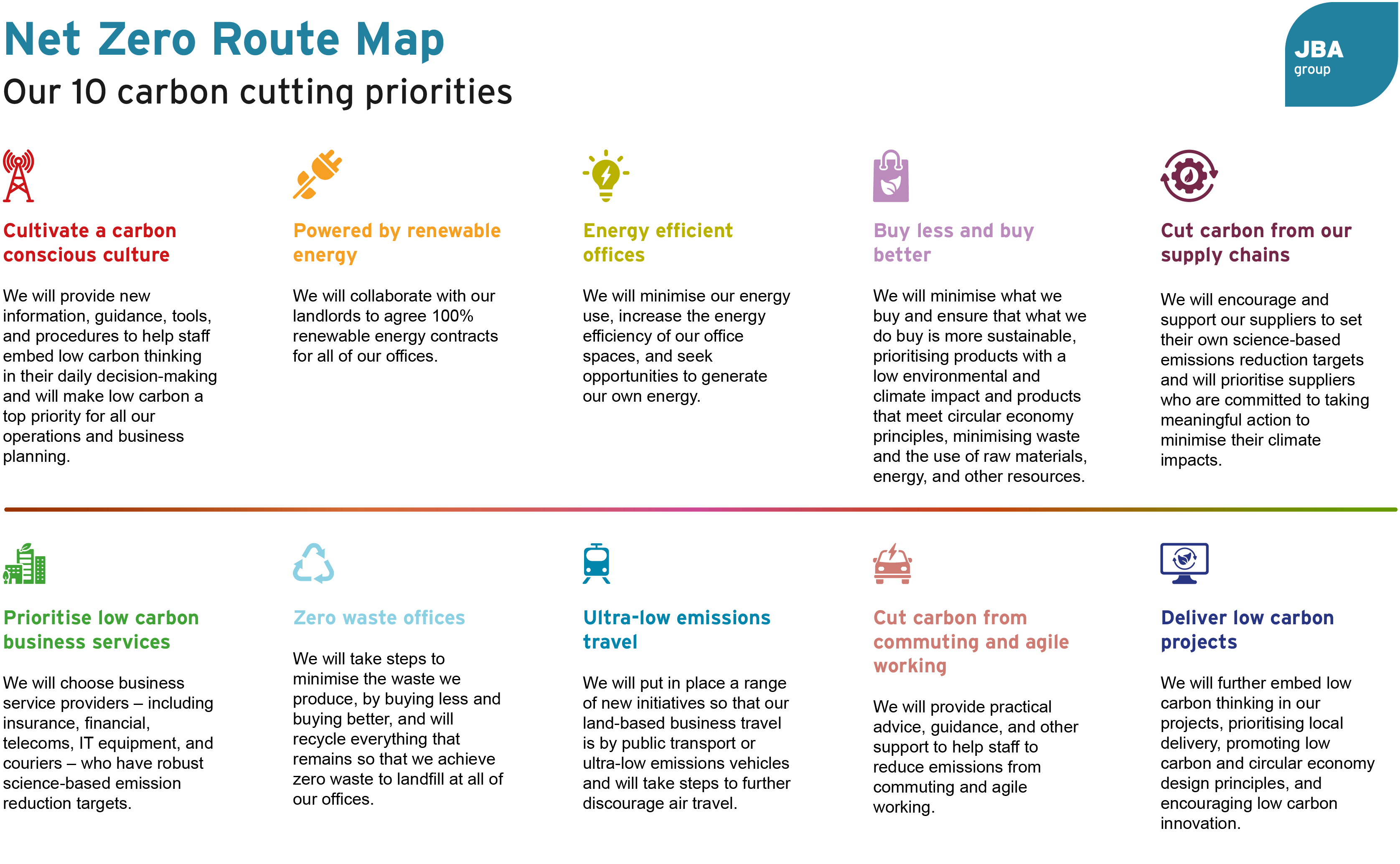 We recently published our new carbon reduction plan - the JBA Net Zero Route Map – supported by a detailed Action Plan. At the core of the Route Map are ten 'Carbon Cutting Priorities' that represent the key steps we need to take to reach net zero outlined. These are outlined in the graphic below.