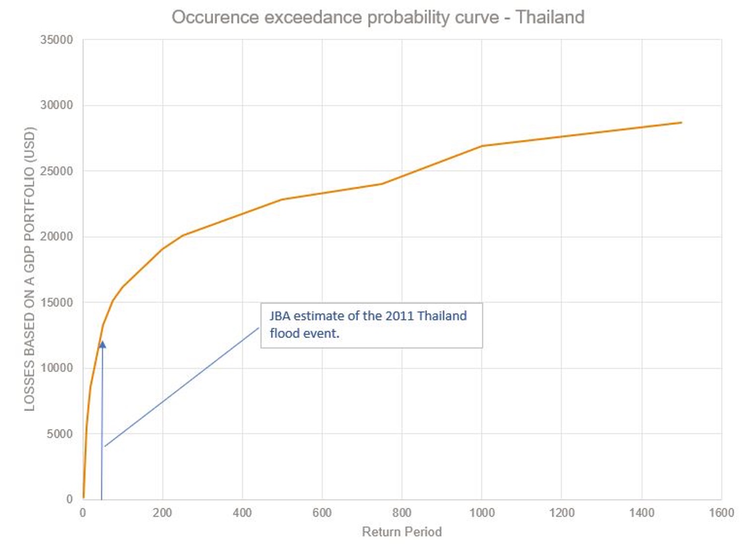 Figure 2: Losses for the 2011 event compared against JBA’s Occurrence Exceedance Probability curve for Thailand using a GDP based portfolio. JBA’s event loss estimate is USD $12.1 billion for direct flood damage.
