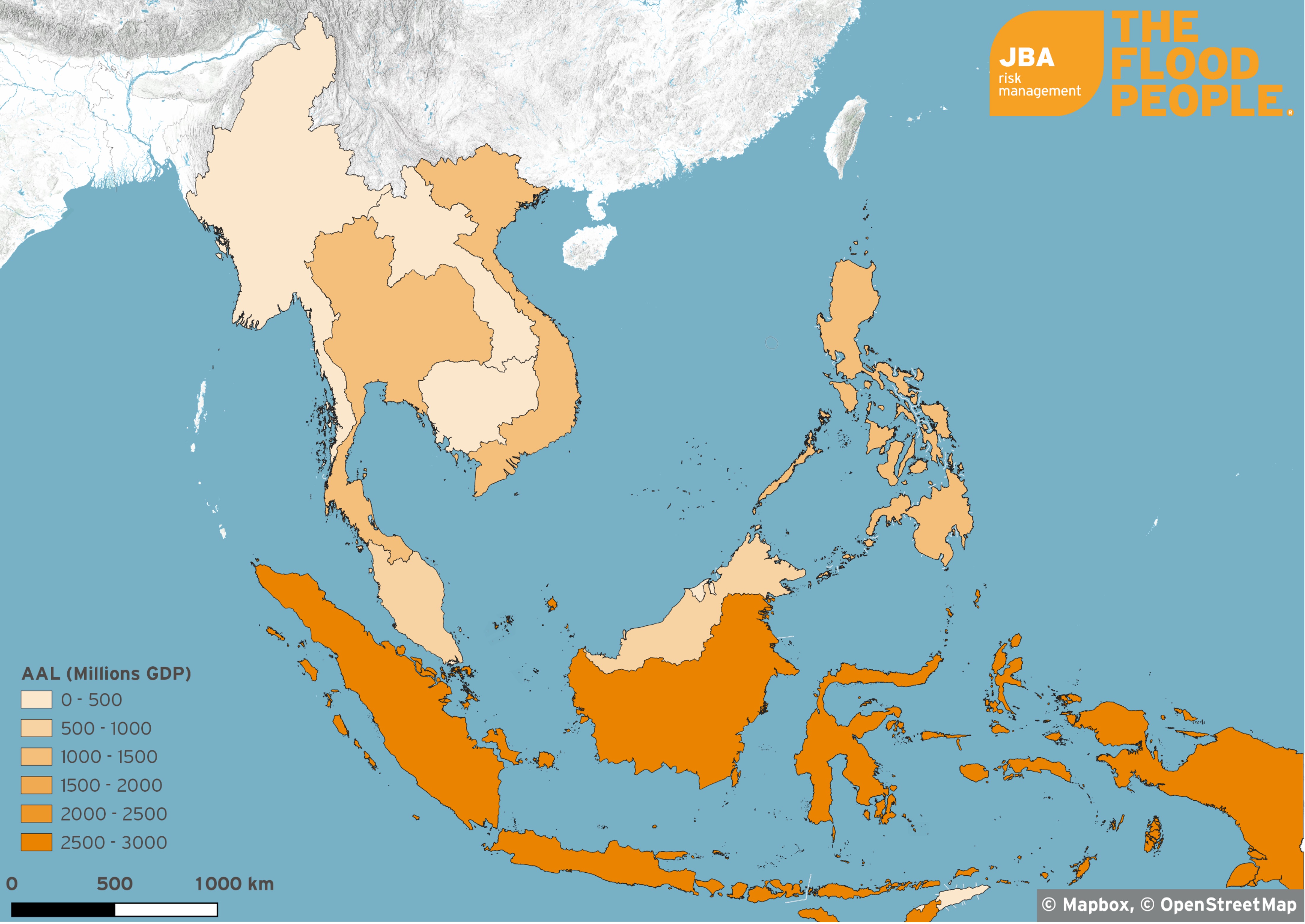 Figure 3: Average annual losses for the South East Asia region using JBA’s probabilistic modelling. These losses were produced from a disaggregated portfolio consisting of residential buildings. Buildings were assigned a total insured value that was equally proportioned by the GDP of each country.