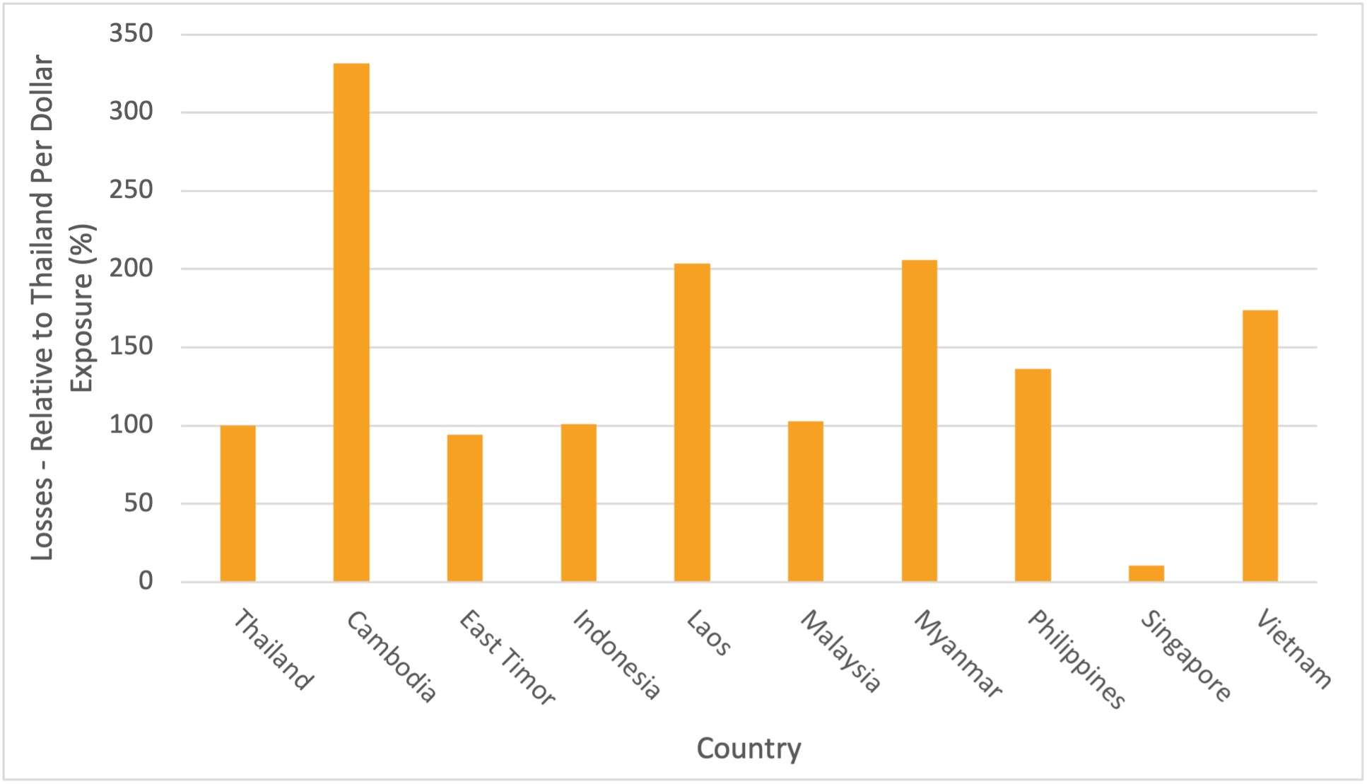 Figure 5 shows that on a per dollar basis of exposure, losses in Vietnam, Myanmar, Laos, the Philippines, and Cambodia are all expected to be higher than those incurred in Thailand.