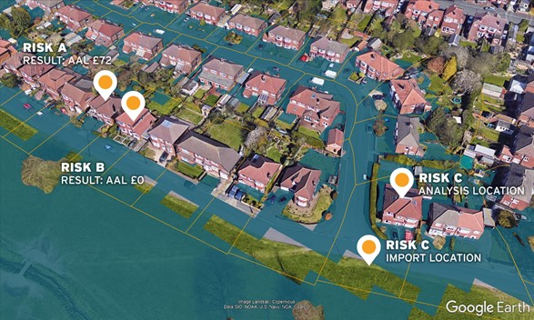 Risk C in the image represents a risk geocoded to street address level. As the import location falls within the orange outlined area, the model associates it with the building for analysis and only the water depths affecting the building are used to estimate loss for risk C. The ability to identify risks that fall close to, but not directly on, the building, ensures portfolios without rooftop level geocoding are still making full use of the high-resolution hazard data and producing a robust estimate of flood loss.