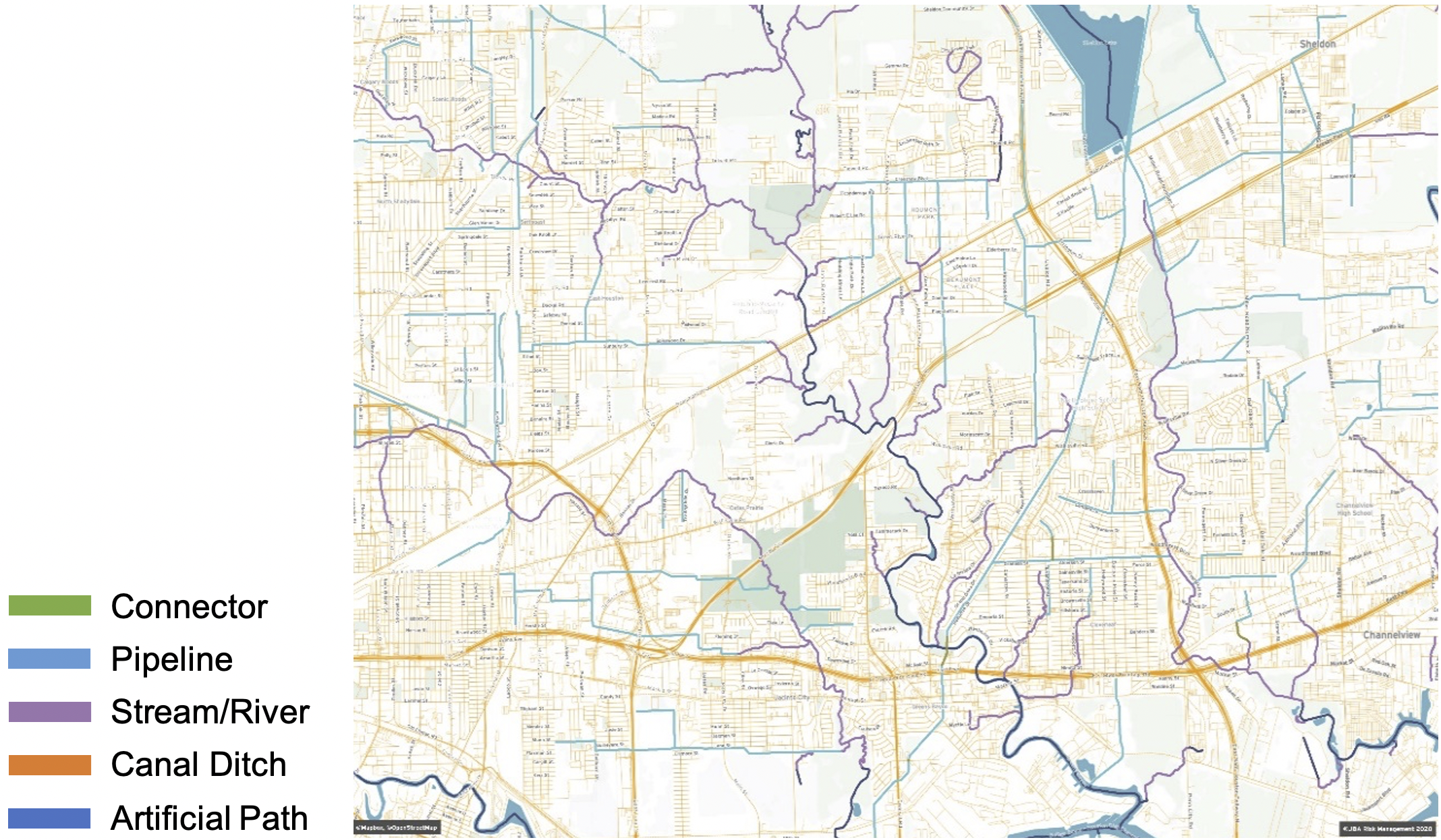 Figure 1: A map of Houston with the various waterways as defined in the National Hydrography Dataset provided by USGS.