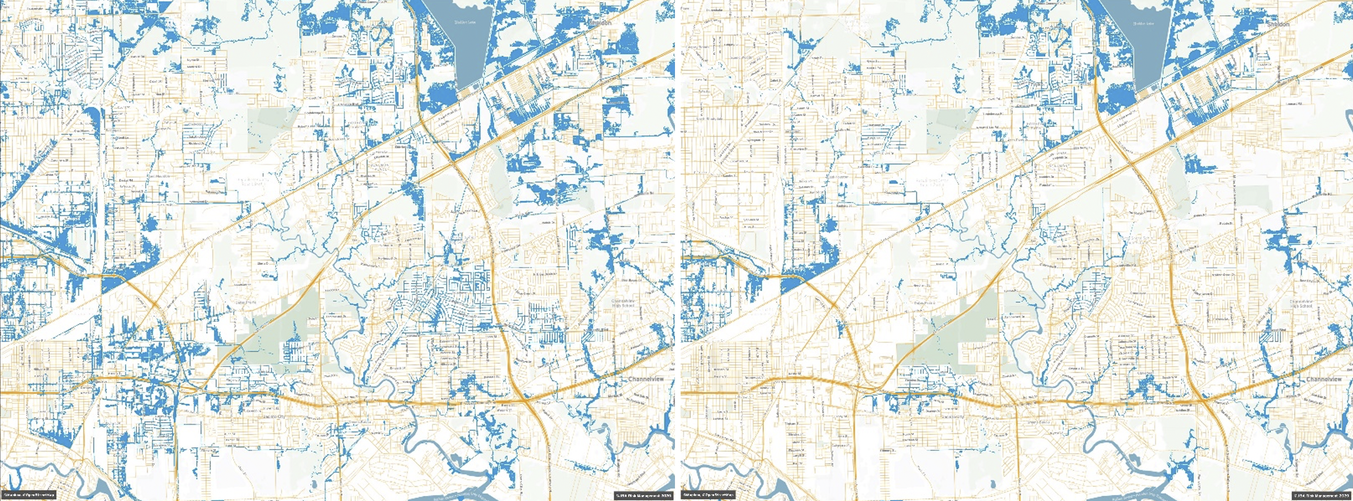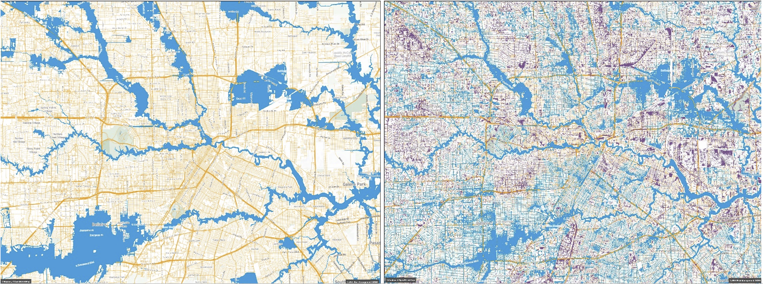Figure 6: The flood hazard extents of FEMA's RP100 fluvial flood map (left) and JBA's equivalent RP100 fluvial and pluvial flood maps (right).