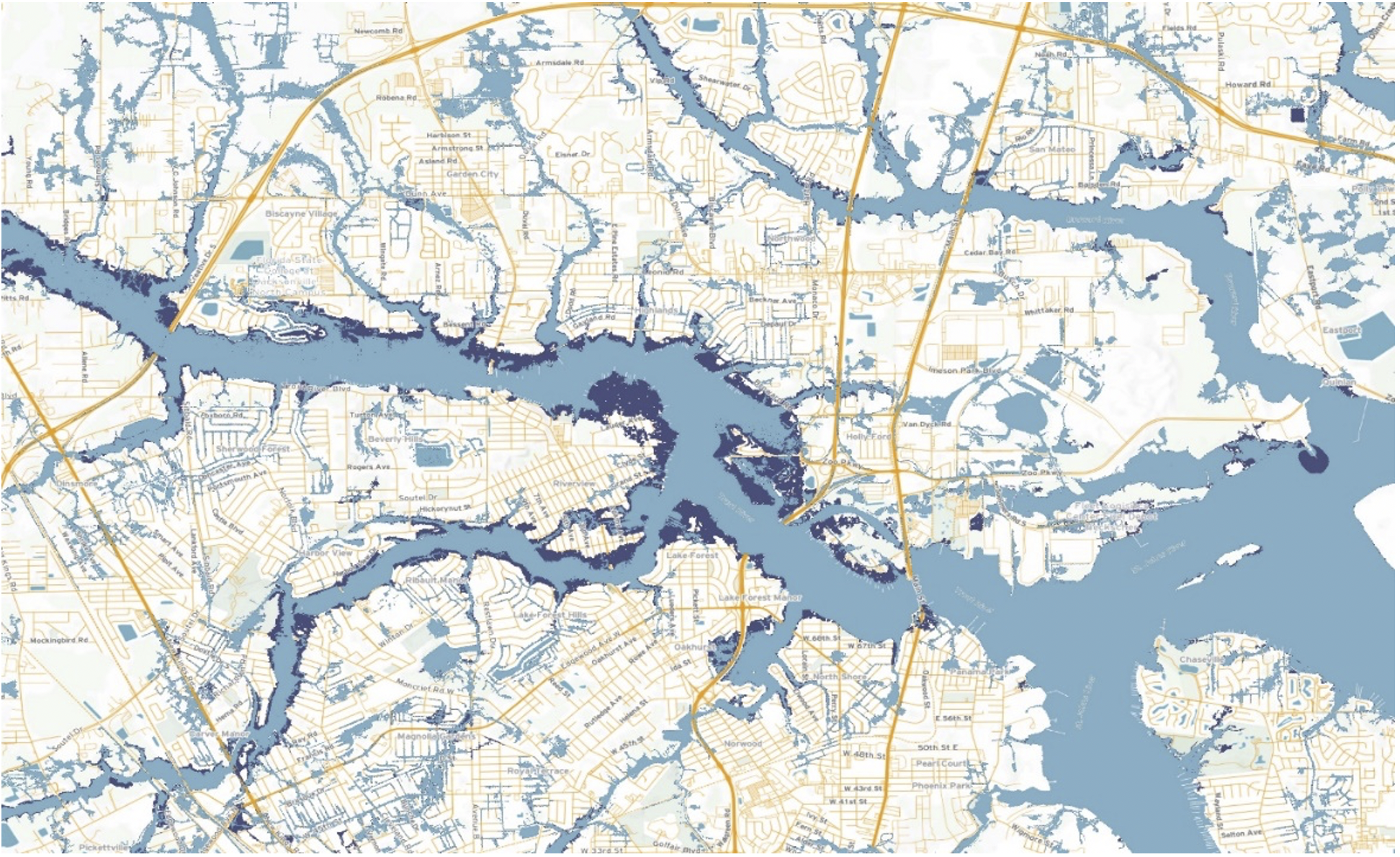 For example, the image in Figure 3 shows the city of Jacksonville in Florida. In normal weather conditions, the tidal range means that even at high tide, water in Trout River is able to discharge into St John’s River unimpeded. In hurricane conditions, however, the combined low pressure and high winds can cause extreme storm surges, with sea water being forced many kilometres inland up the St John’s estuary. The ability for Trout River to discharge is therefore limited by the backwater effect of the surge conditions and inland flooding from heavy rainfall is therefore exacerbated.
