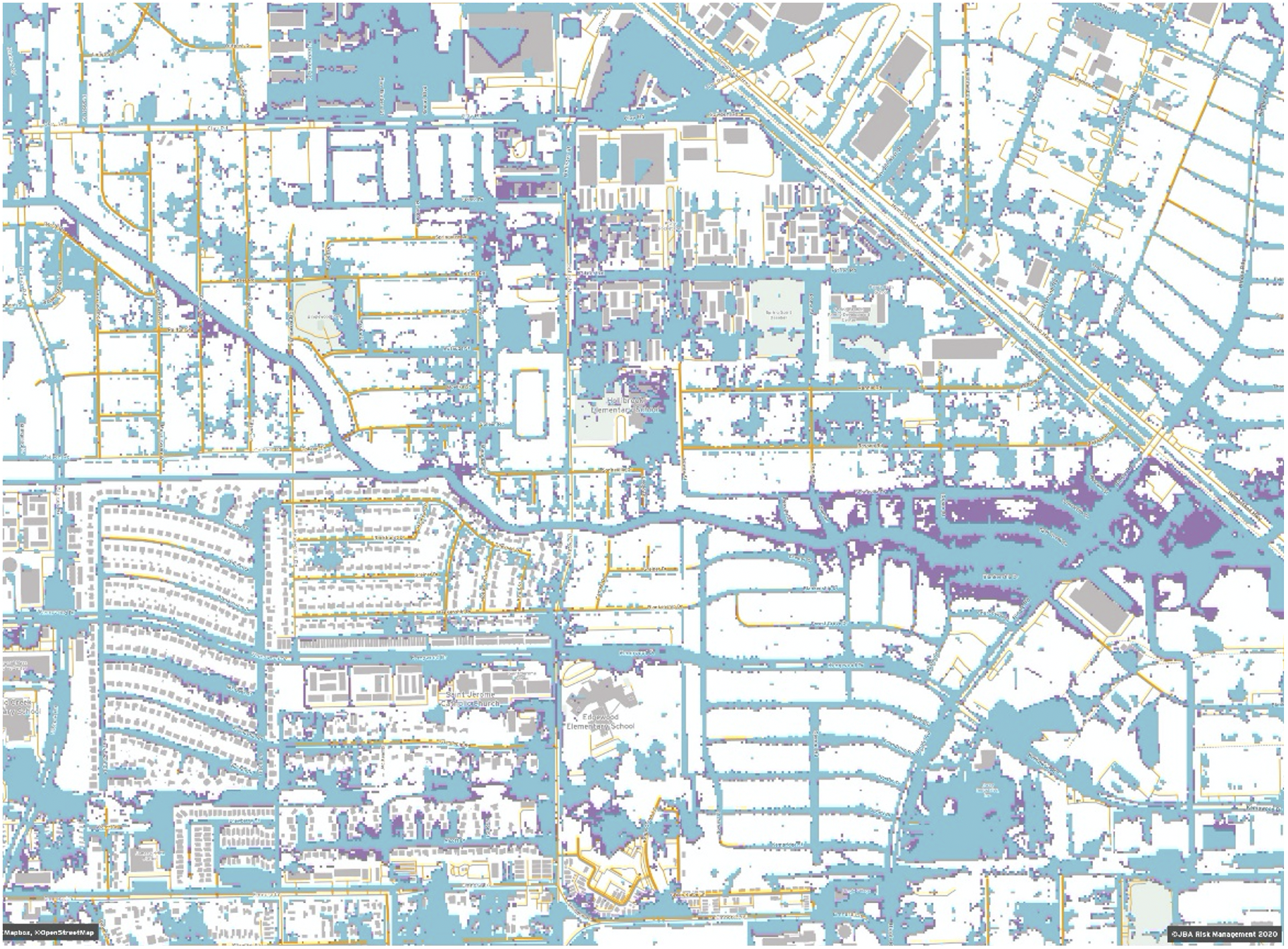 Figure 6 shows how two design flood maps for the same area can present two very different views of risk. The map on the left, from FEMA, indicates far fewer areas as having a flood risk than the map on the right from JBA, due to different decisions made when creating the flood map.
