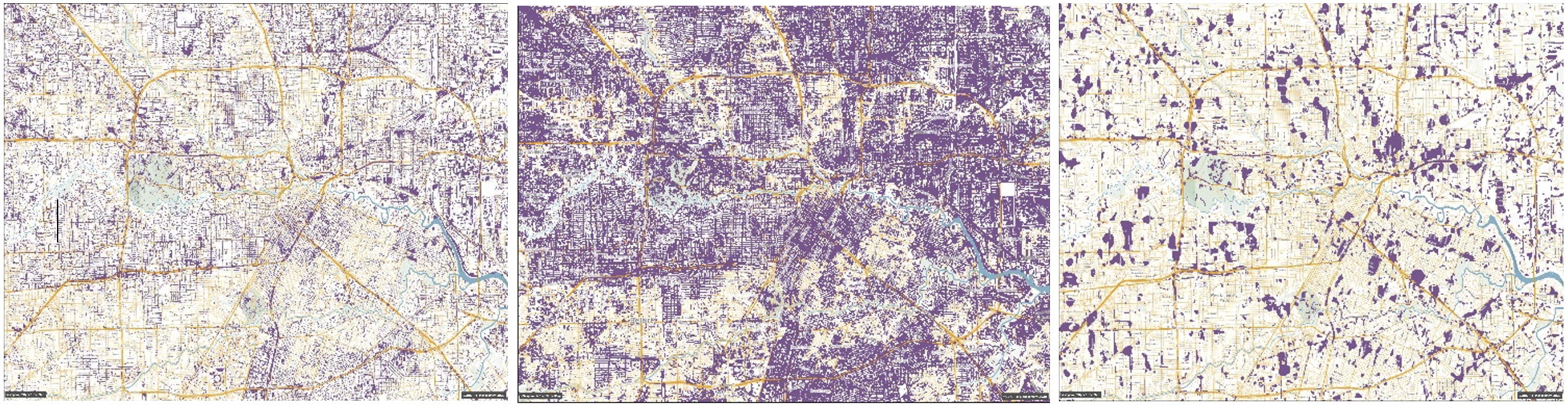 Figure 5: The difference in flood maps when modelled at different resolutions. Left: pluvial flood map hydraulically modelled on 5m grid. Middle: pluvial flood map hydraulically modelled on 5m grid and resampled to 30m. Right: pluvial flood map hydraulically modelled on 30m grid.