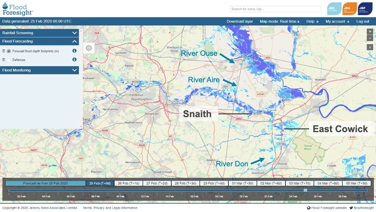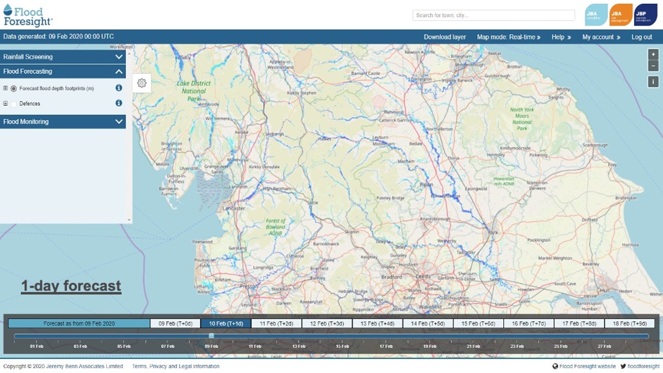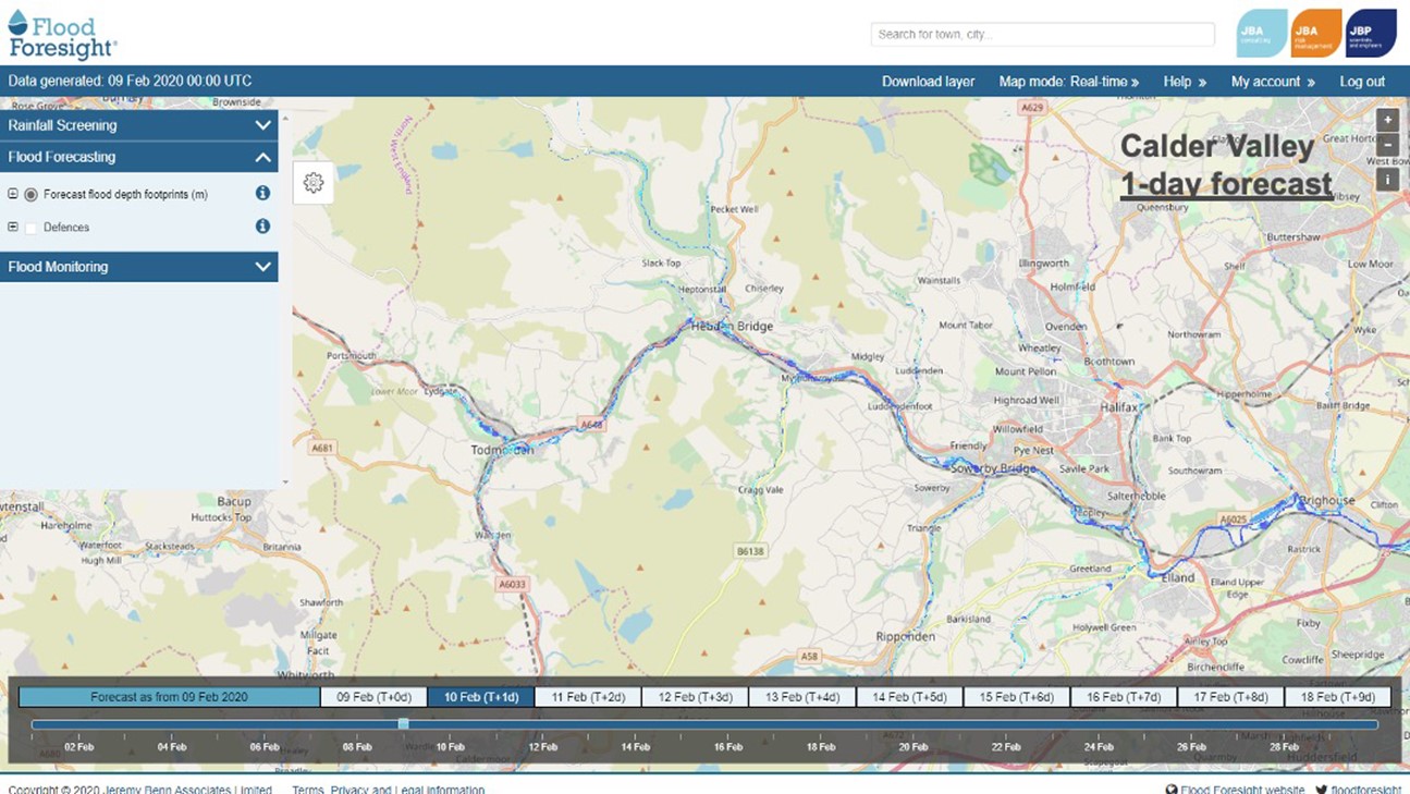 Figure 4: Flood Foresight forecast for the Calder Valley from 9 February for 10 February.
