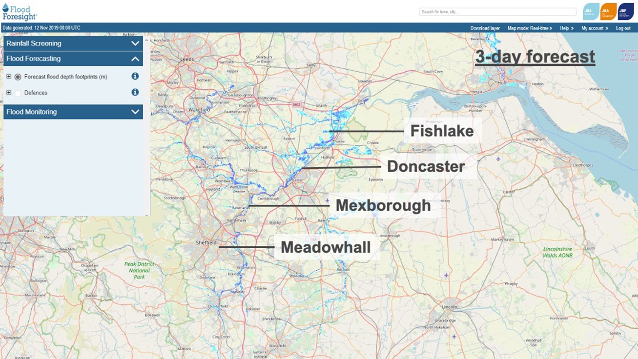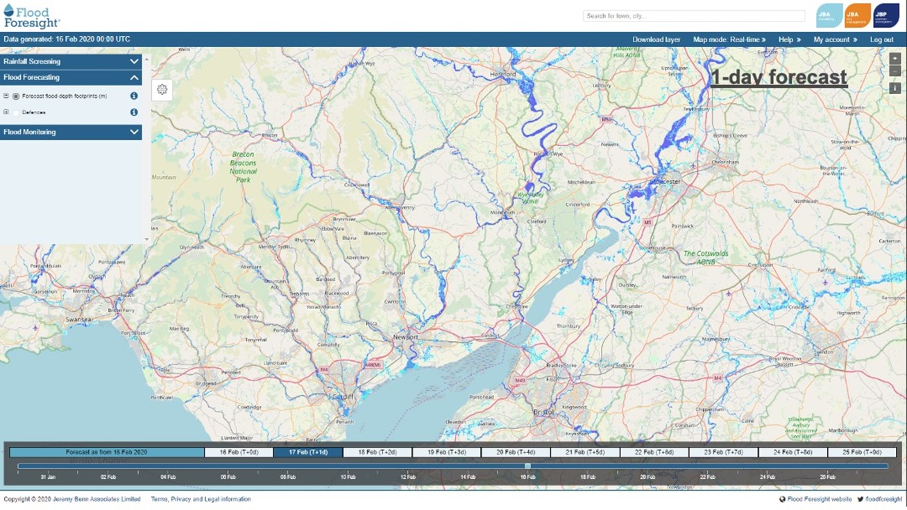 Forecasting does not offer a crystal ball view into the future, but the tools are sophisticated enough to add real value. JBA has developed a forecasting tool called Flood Foresight to consider all the complicated factors related to forecasting flood and help our clients overcome the challenges. Flood Foresight demonstrates the potential for flooding over the ten-day period leading up to an event and monitors flood throughout the duration of an event using telemetered data in real time. We use this tool along with the JBA rapid post-event response assessment and flood footprints to analyse events for our clients.