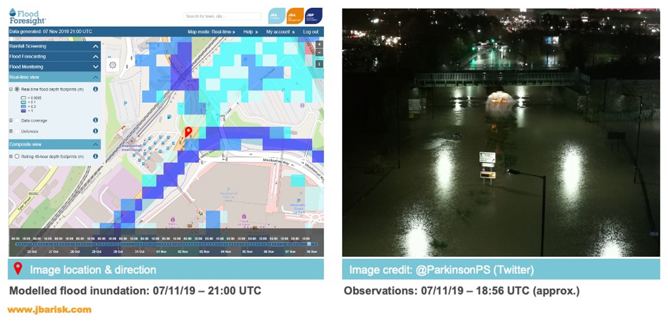 Figure 2: Flooding monitored by Flood Foresight, and observed flooding at Meadowhall, Sheffield, 7 November 2019.