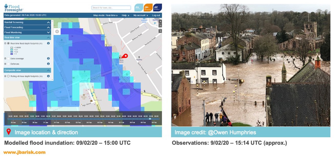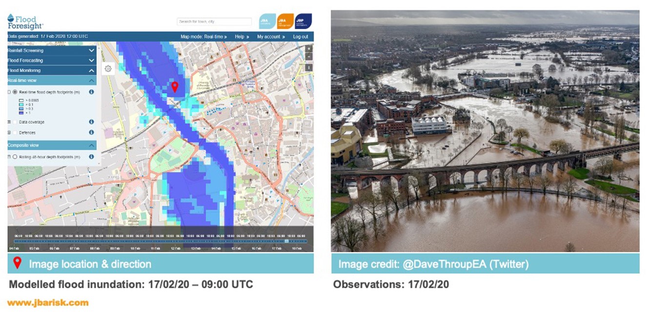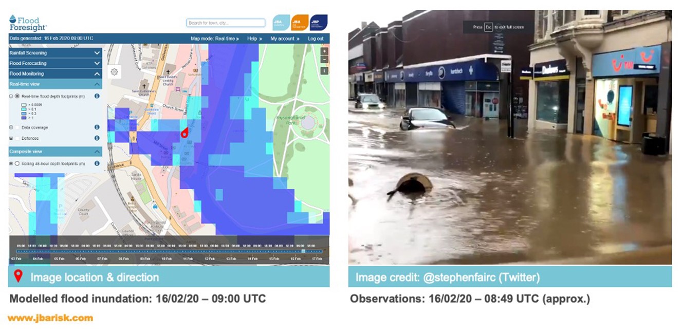 In Figures 8 and 9, we show monitored flood footprints on the left and snapshots from the ground on the right. Figure 8 captures the scene in Pontypridd in Wales and Figure 9 shows the scene just over the border into England in Worcester.