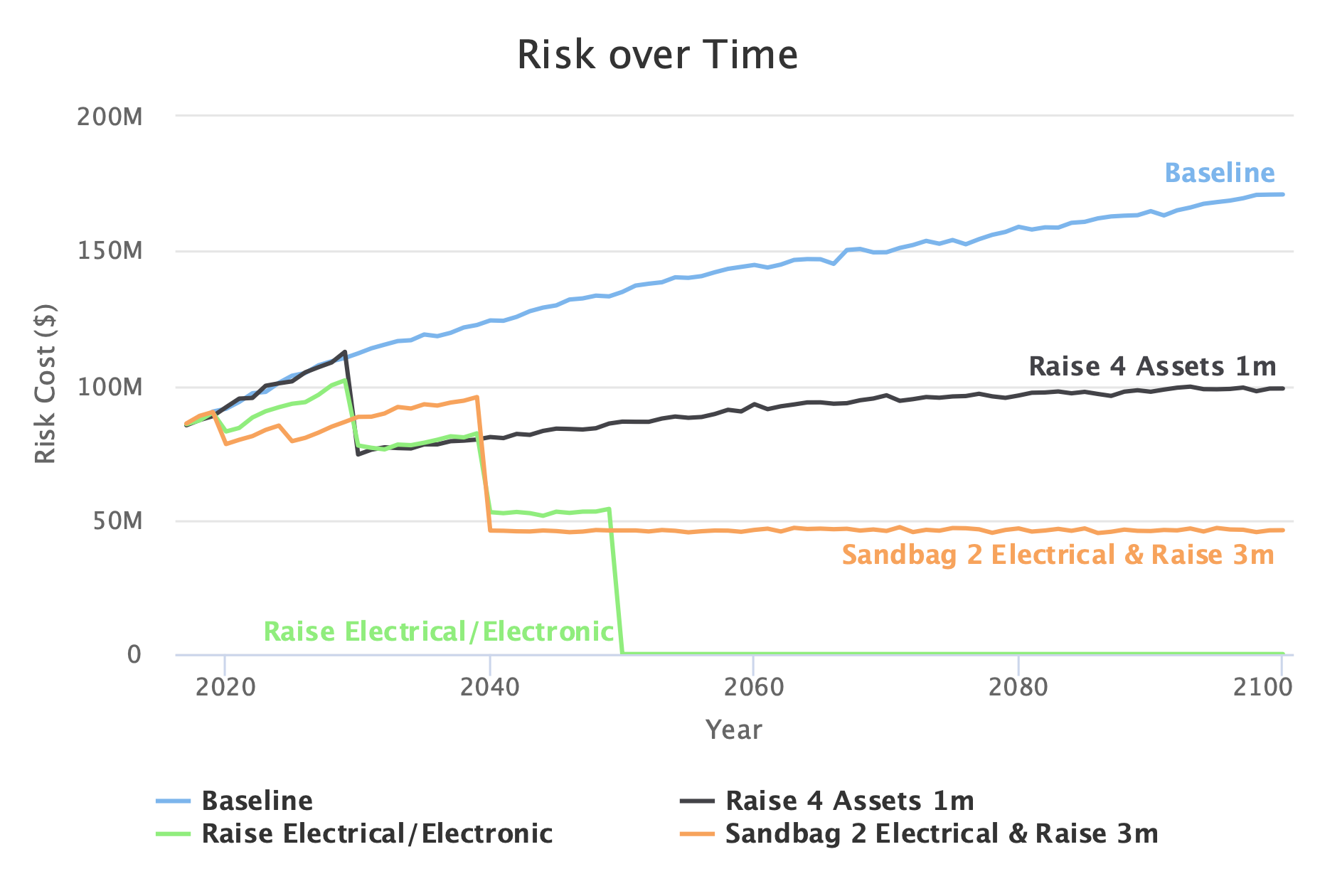Figure 1: Analysis on 3 adaptation pathways shows raising electrical components has maximum impact on risk cost over time. Adaptation actions are tested against base unadapted (no action) pathway to provide comparison of effectiveness vs cost.