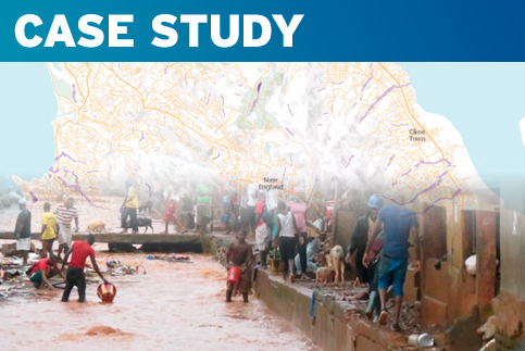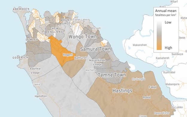 In 2017, JBA and Arup worked with other technical experts and local specialist partners on a World Bank funded assignment to reduce the risk to the local population in Sierra Leone from flooding and landslides in three key cities. The project demonstrated the importance of placing local knowledge and information at the heart of detailed risk studies and the flexible application of probabilistic modelling to socio-economic impacts, which had historically been used for assessing financial risk for re/insurers. The image shows outputs of modelled fatalities for a city in Sierra Leone. You can read more here.