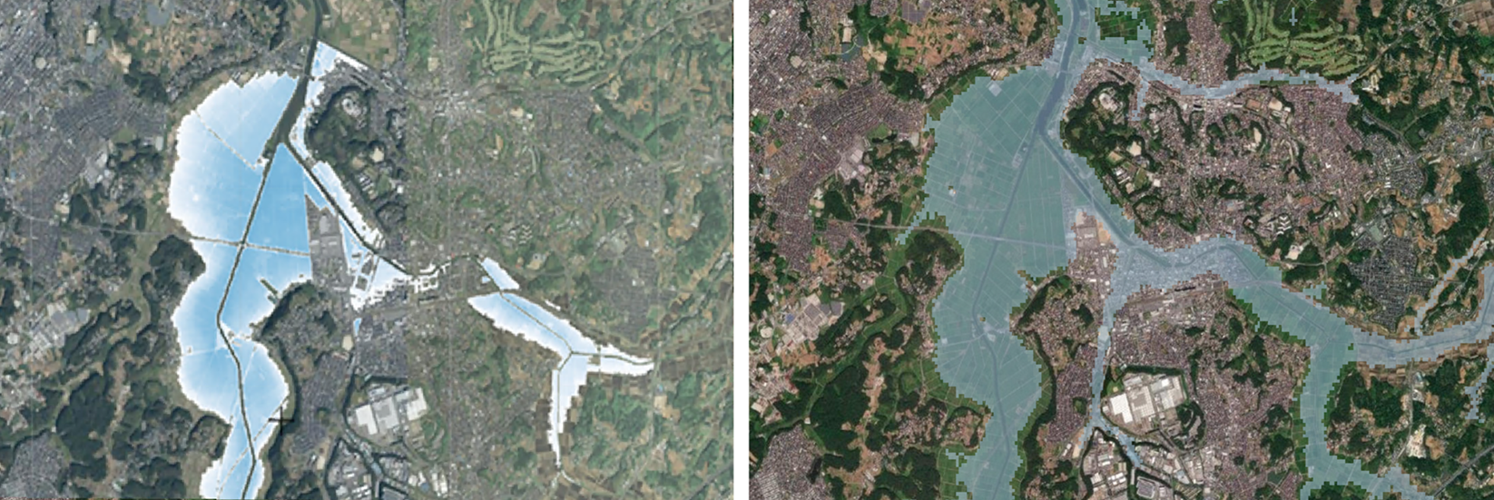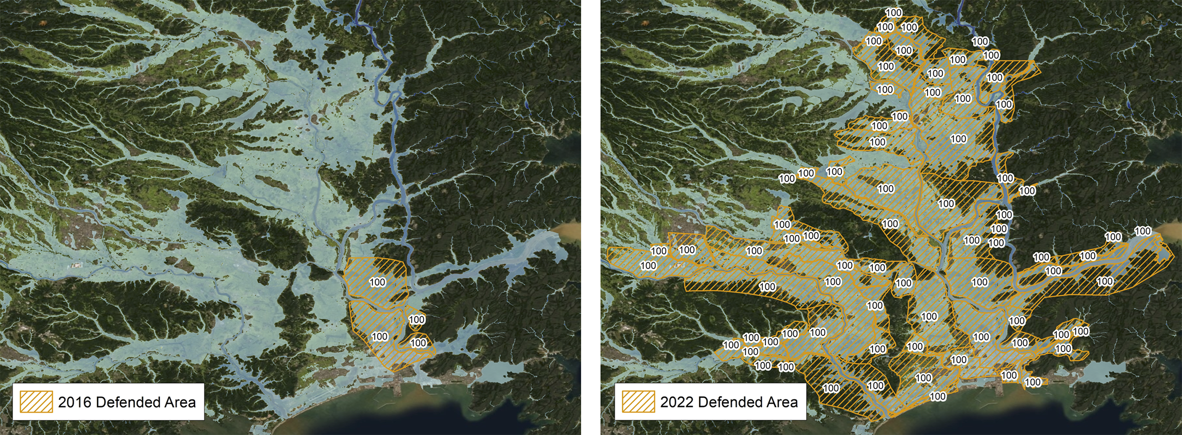 Figure 4: Change in defended areas for the city of Ishinomaki between 2016 JBA flood mapping (left) and 2022 flood mapping (right). World Imagery - Source: Esri, Maxar, GeoEye, Earthstar Geographics, CNES/Airbus DS, USDA, USGS, AeroGRID, IGN, and the GIS User Community.
