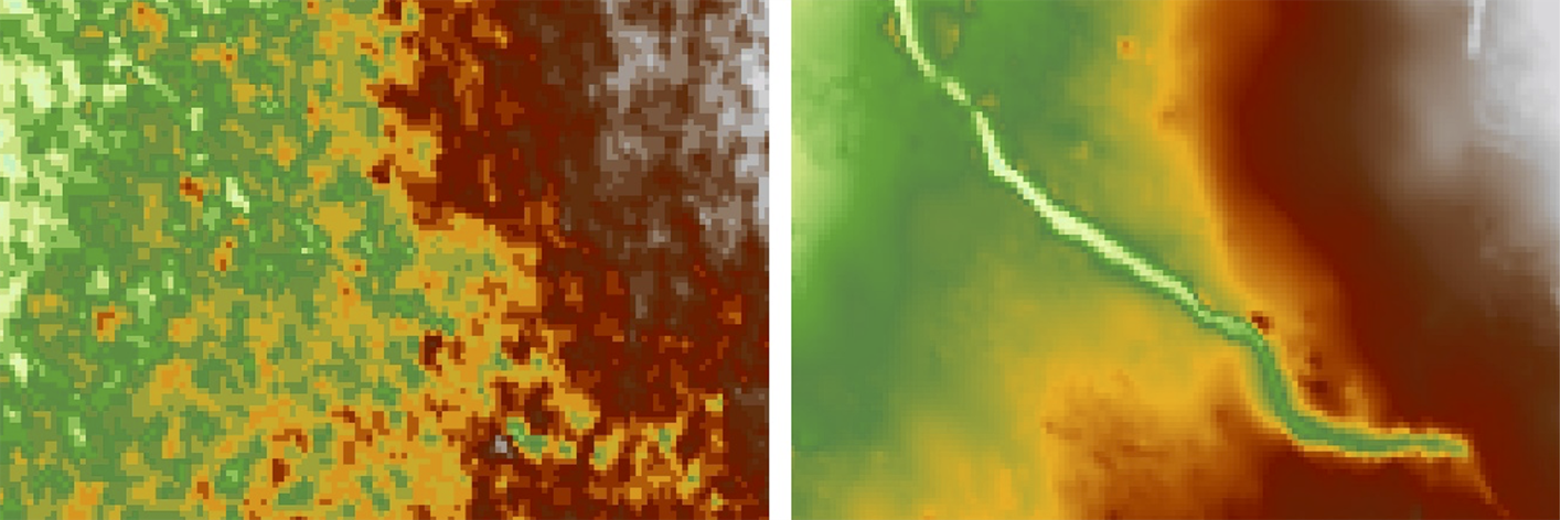 Figure 1: A comparison showing digital surface model data, which captures the Earth's surface including trees and buildings; in comparison to bare earth digital terrain model data used in the 2022 mapping (right). Through using bare earth terrain data, we see the river channel and surrounding topography much more clearly. DSM image source (NASA Shuttle Radar Topography Mission (SRTM)(2013). Shuttle Radar Topography Mission (SRTM) Global) ), DTM image source (Airbus WorldDEM DTMlite).