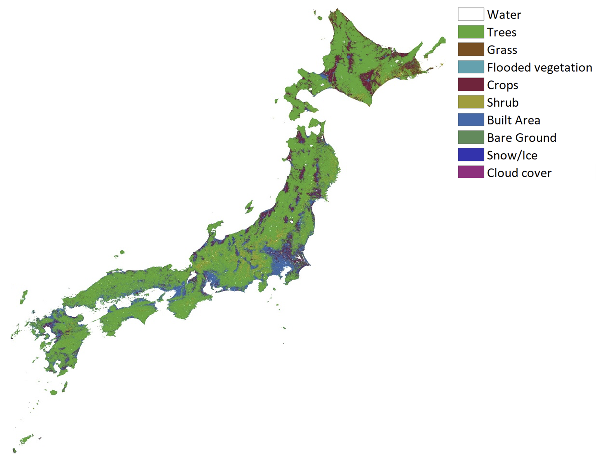 Figure 3: New land cover dataset with 10 land use classifications for Japan, enabling improved representation of land use and water flow paths. Image created by JBA Risk Management using ESRI data.