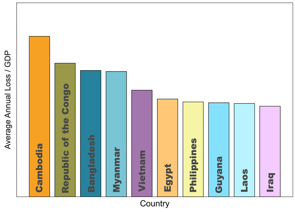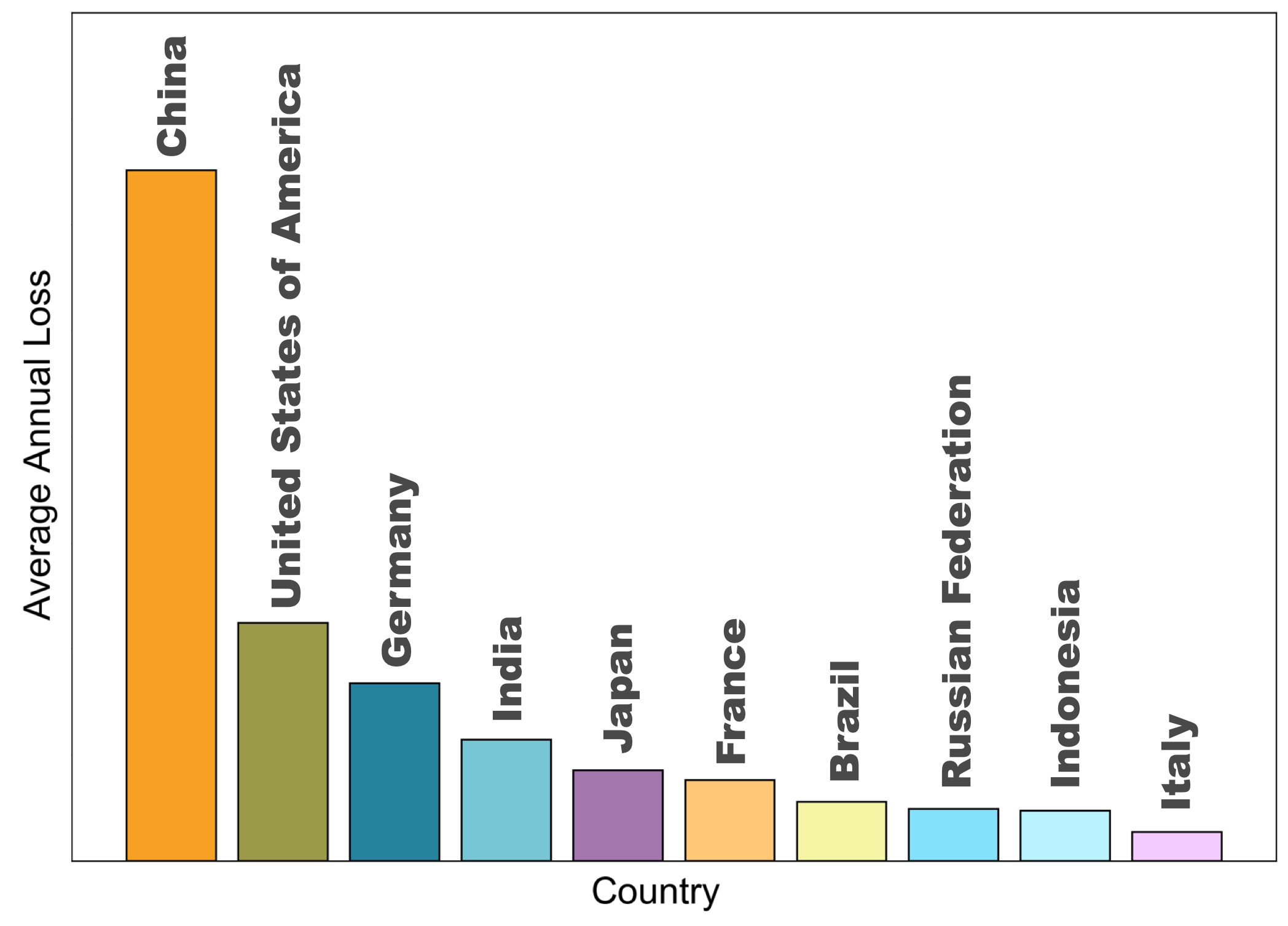 If we plot the same results as absolute AALs, the results look very different, as expected, with GDP playing a greater role. China’s at the top, followed by the US, Germany, India and Japan.