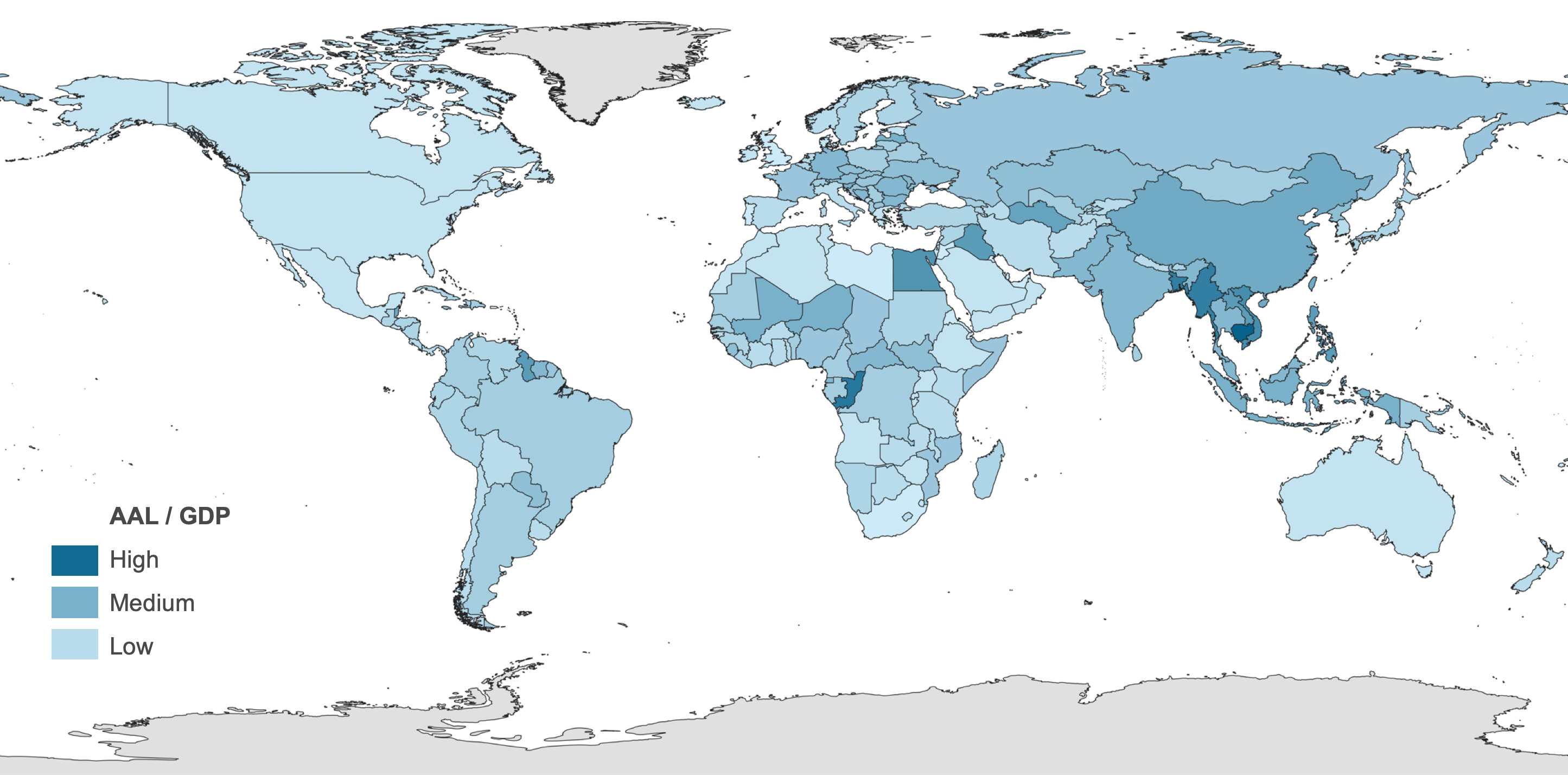 Loss results from an example global portfolio using the Global Flood Model. Dark blue is highest in loss. Total Insured Value per country is represented by GDP and the number of locations is weighted by population.