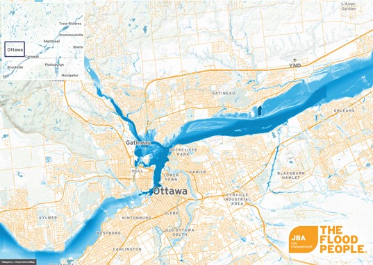 Using river and rain gauge information, or JBA’s innovative Flood Foresight® forecasting application, we begin by extracting peak rainfall and river levels at each affected gauge. Using this, a predicted return period for these gauges is derived by comparing the flood peaks with our hydrological databases, assigning the predicted return periods of each gauge to the return periods of the nearest pre-existing flood map. Pictured: flood footprint from 2019 flooding in Canada