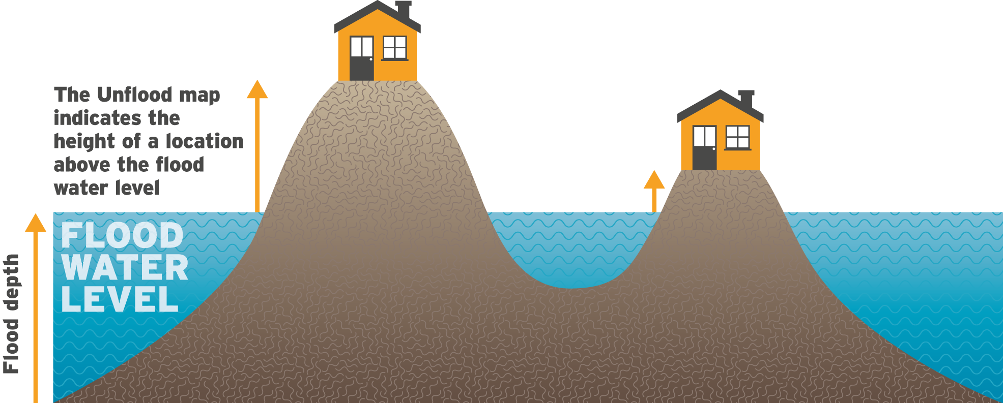 The Unflood maps help to distinguish between all of the areas that fall outside the flood maps and can be used to locate areas and properties that may still be susceptible to flooding under more uncertain scenarios.