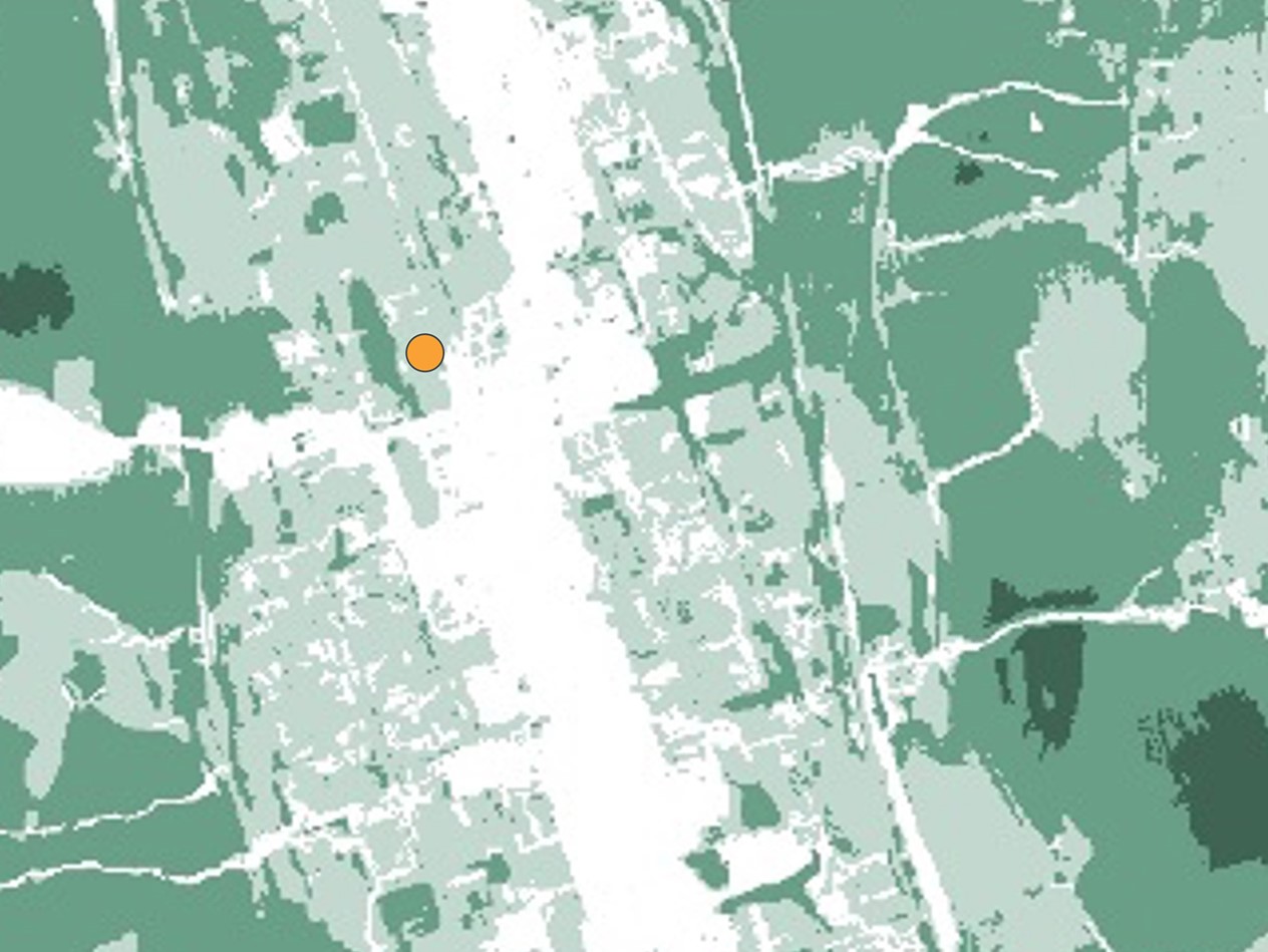 The image (above) shows how close the property (orange dot) is to the nearest flooding (white), and also its height above this flooding (pale green representing band 1 through to dark green representing band 3).