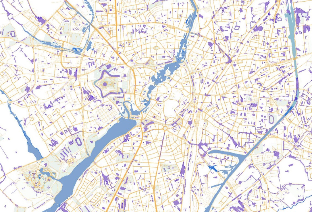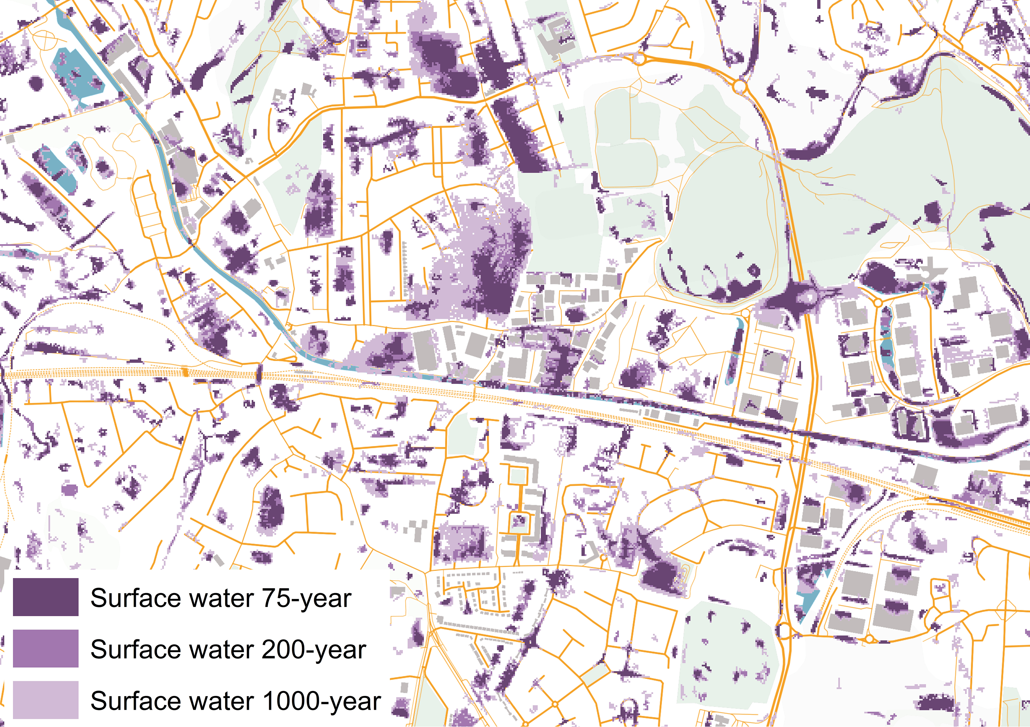 Pictured: JBA 100-year return period flood map for Münster, showing river flood (blue) and surface water flood (purple). The map captures surface water flooding that occurs away from rivers that may otherwise be missed when assessing just river flooding.