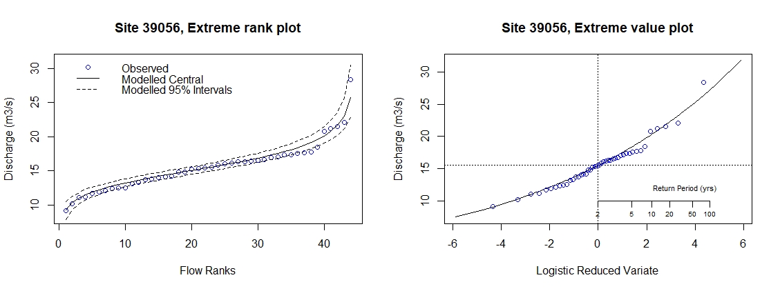 When analysing previous extreme flows, it’s important to compare the results of the model with the observed data. The most common way of doing this is to use an extreme value plot, often called a frequency curve plot. Broadly speaking the plot has flow magnitude on the y axis and probability of exceedance on the x axis. The observed flows and the modelled are then plotted for comparison. This means that a probability has to be attributed to the observed flows in order to plot them.