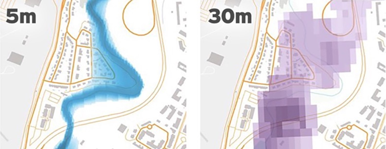 (Above) Difference between 5m and 30m resolution on a flood map.