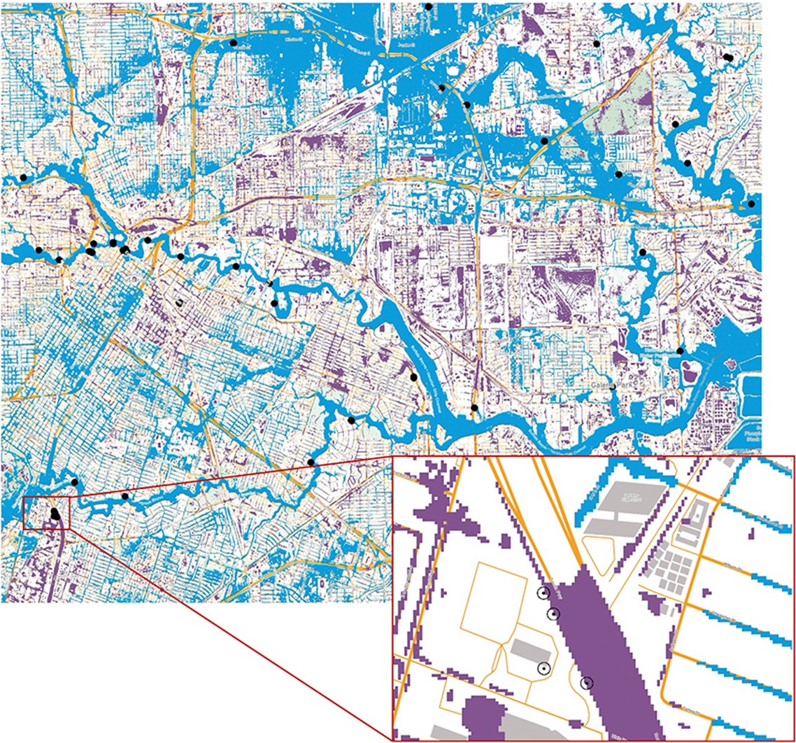 Figure 1: shows the distribution of High-Water Marks (black dots) in Houston overlain on JBA’s 100-year fluvial and pluvial maps.