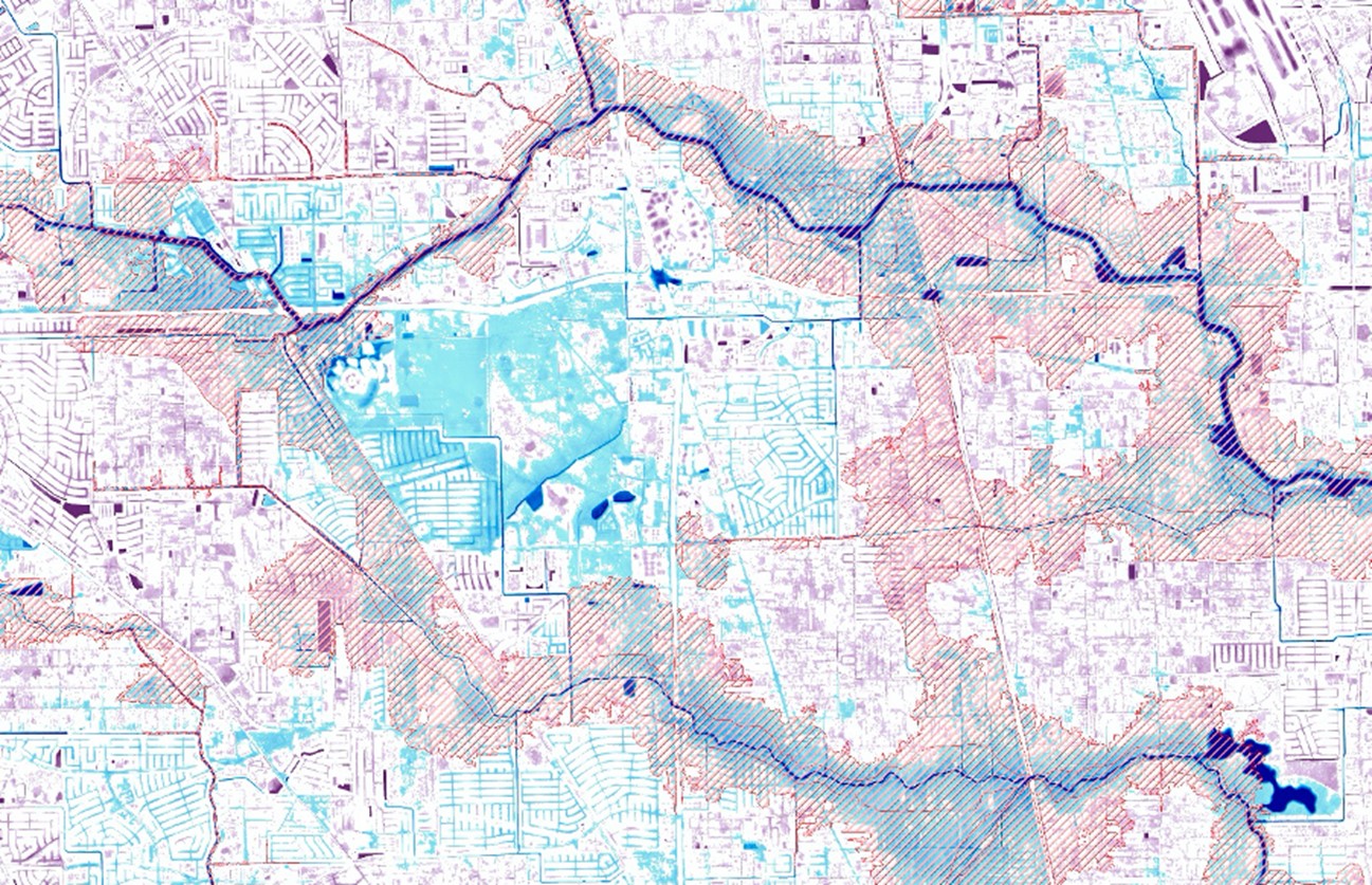 Figure 2: The differences between JBA and FEMA flood maps. The red hatching is the extent of FEMA’s maps and covers the areas in which a homeowner would require insurance if purchasing a mortgage. The JBA maps, covering fluvial and pluvial flood (blue and purple), show a much larger area at risk.