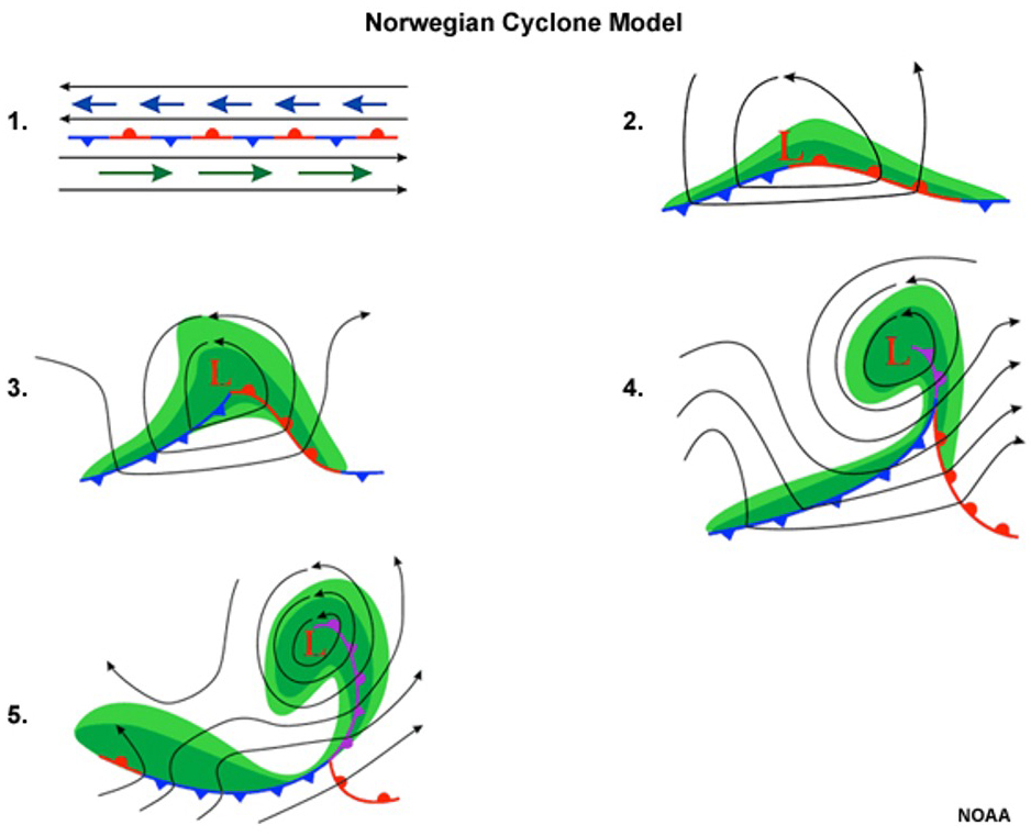 Figure 1: Norwegian model of the stages of cyclogenesis (after Bjerknes, 1919). Illustration: NOAA