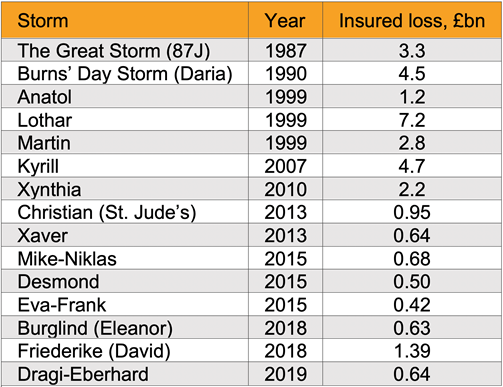 The Great Storm of 1987 was estimated to have felled 15 million trees in the UK alone, including six of Sevenoaks’ eponymous landmarks (Guardian, 2017). Windstorm Lothar (December 1999) resulted in the largest insurance loss of the 20th century in Europe, estimated at £7.2bn (Swiss Re, 2019).