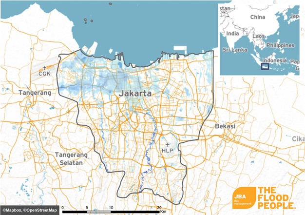 Figure 1: Illustration of Jakarta 2007 flood event which had a 50-year return period. JBA Indonesia River Flood Maps (50-year Return Period) are provided for context (JBA Risk Management Limited).