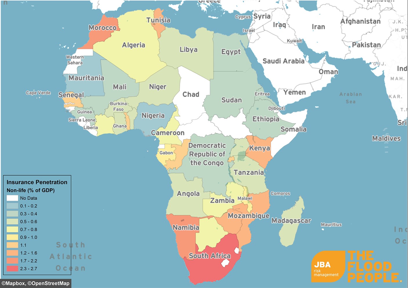 Figure 4: Non-life insurance penetration rates for countries in Africa. (Data source: Swiss Re, 2017)