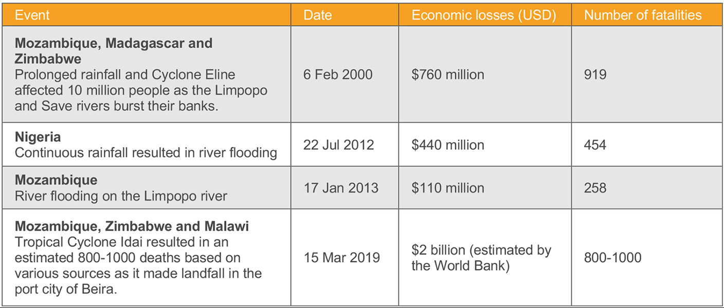 Table 1: A summary of several historical flood events and economic losses. (Data source: Swiss Re, 2019 and World Bank, 2019)