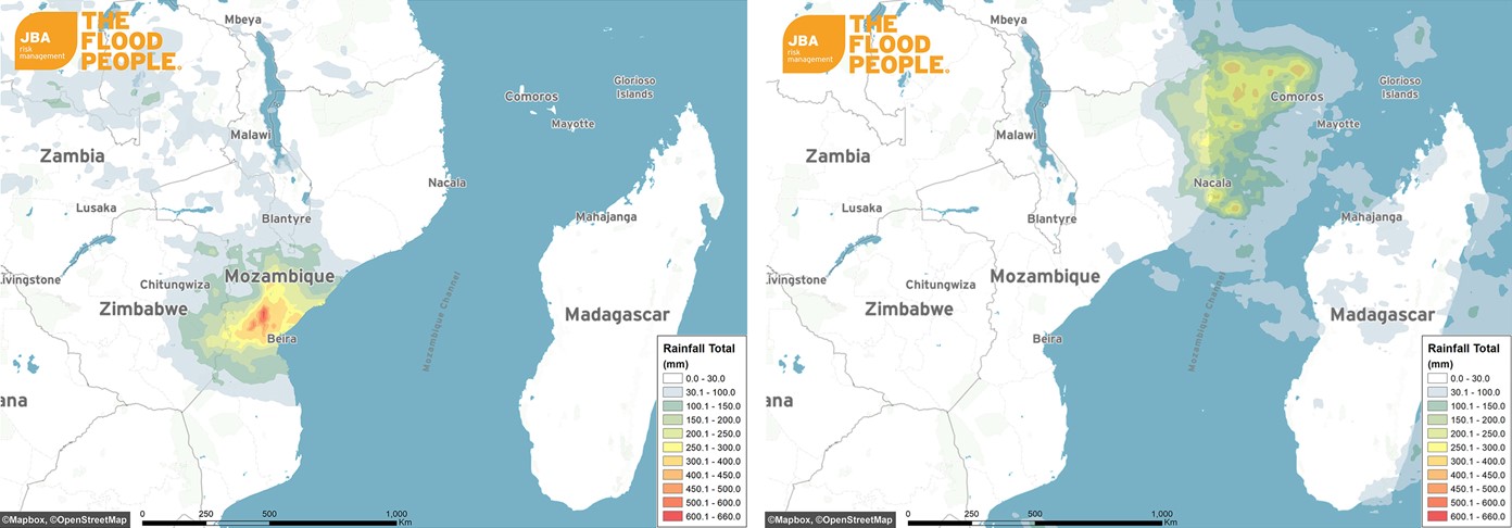 Figure 3: Rainfall accumulation for Mozambique due to Tropical Cyclone Idai from 13-18 March 2019 (left) and rainfall totals from Cyclone Kenneth between 20-25 April 2019 (right).