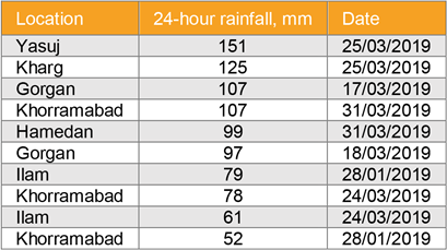 Table 1: Selected daily rainfall totals recorded over Iran during early 2019 (data source: Floodlist, 2019)