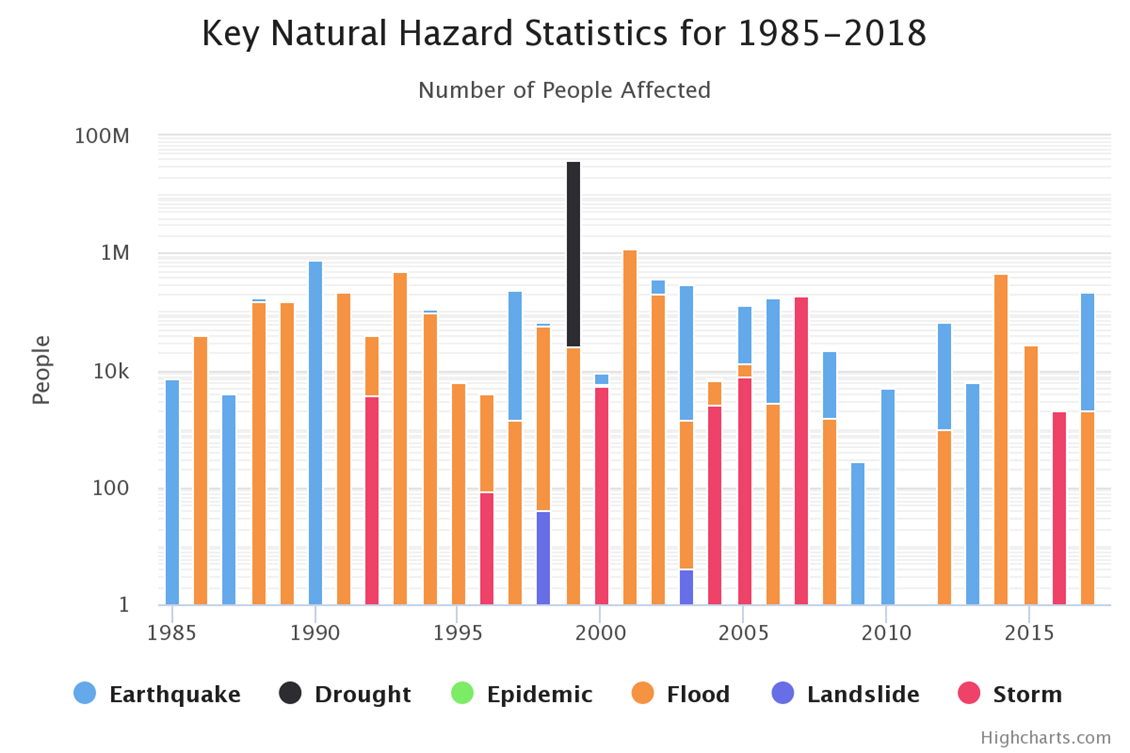 Figure 4: Main hazard risks to Iran, measured by number of people affected, for the period 1985-2018 (source: World Bank, 2019)