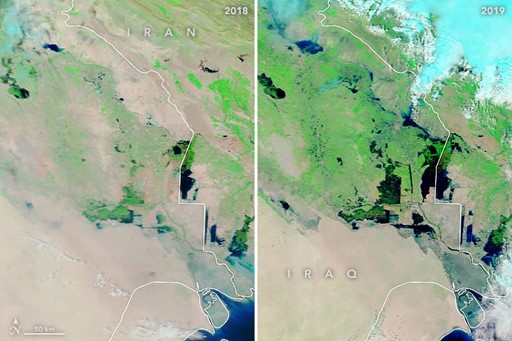 Figure 3: Satellite image showing the comparison of land area flooded along the Iran-Irag border on 3 April 2018 (left) and 28 March 2019 (right). Dark areas in the centre of each image indicate flooded areas (image source: NASA Earth Observatory)