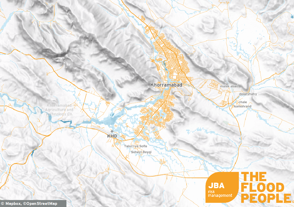 Figure 1: JBA's 1-in-50-year Iran 30m river flood map for the city of Khorramabad, located in the Lorestan region in south-west Iran, one of the worst affected areas (JBA Risk Management).