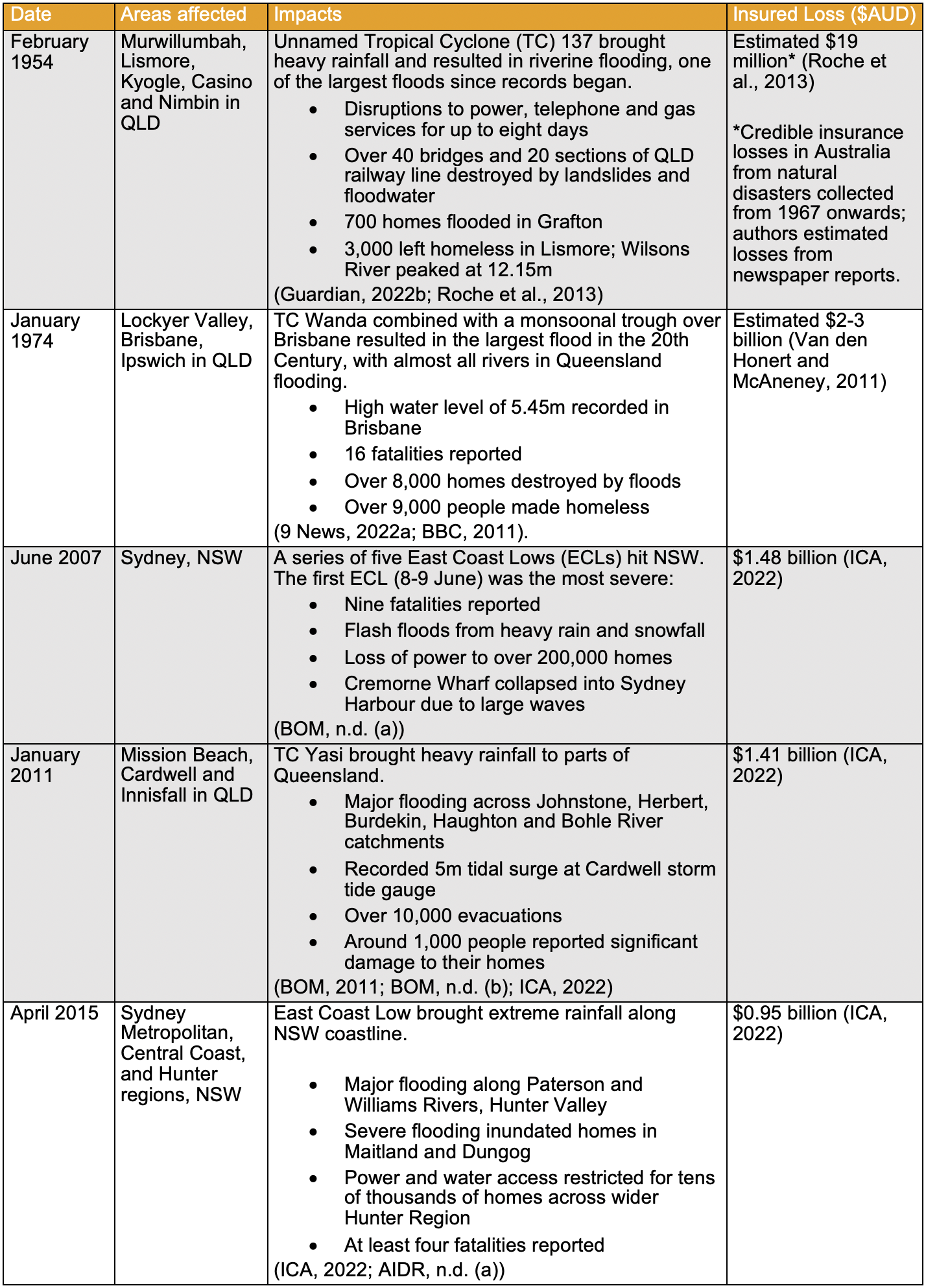 Table 2: Impacts and losses from five significant historical flood events across Queensland (QLD) and New South Wales (NSW).