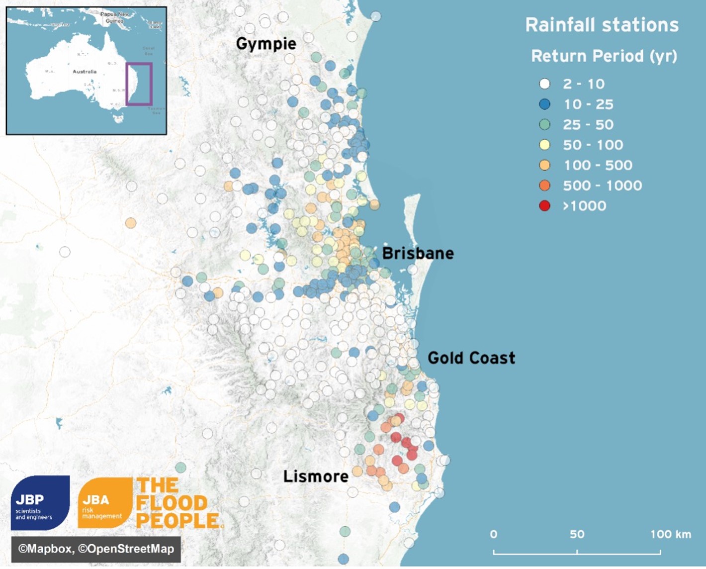 Figure 5: Estimated return periods from the maximum daily rainfall measured between 22-28 February 2022 at rainfall stations in Queensland and New South Wales. Data from Bureau of Meteorology Commonwealth of Australia (2022b). Data analysis conducted by JBP; maps produced by JBA Risk Management.