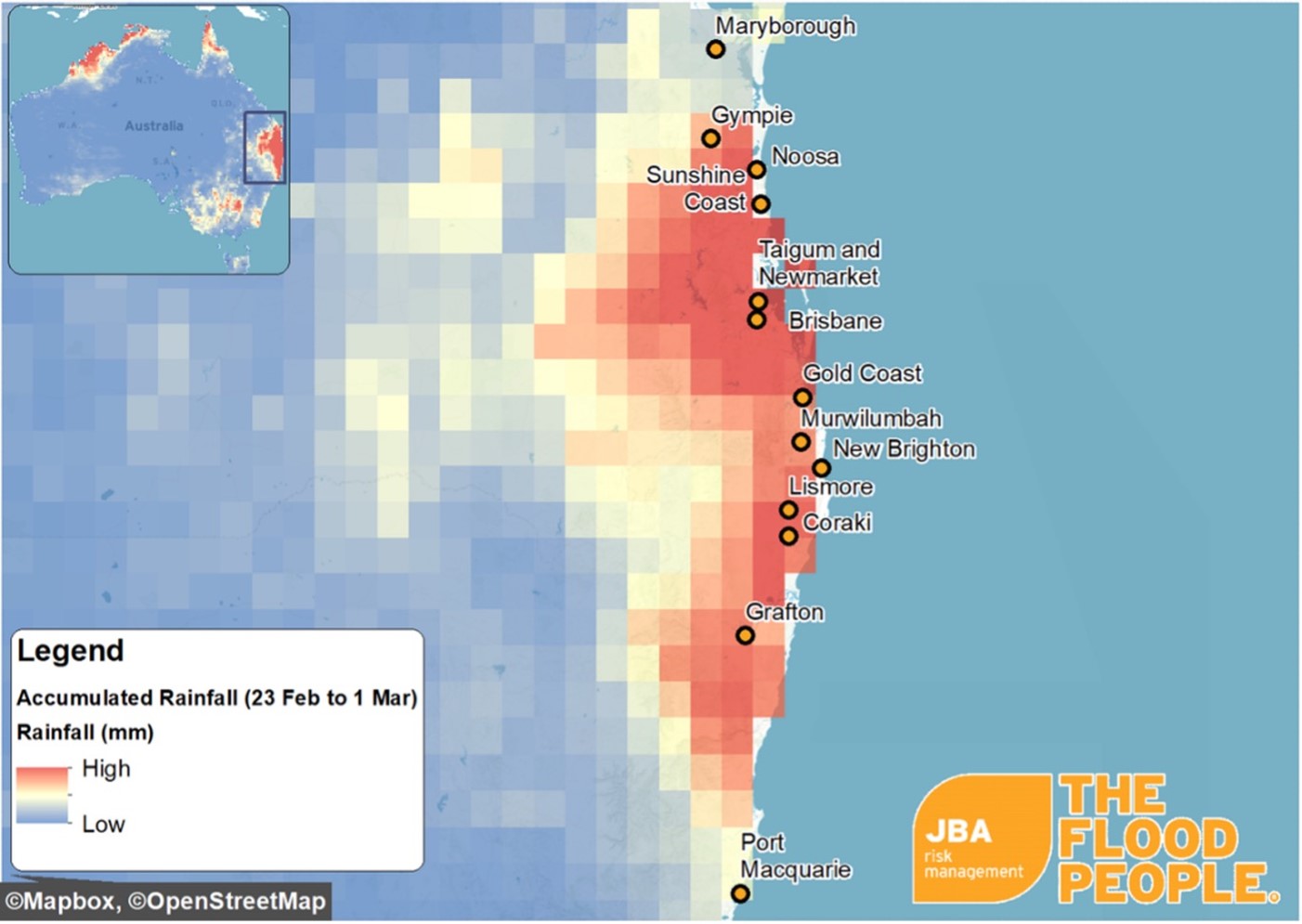 JBA's Event Response team has produced a flood footprint for the event, providing estimated extents and depths for Queensland and New South Wales. To access the footprint or for more information, email the team at EventResponse@jbarisk.com.