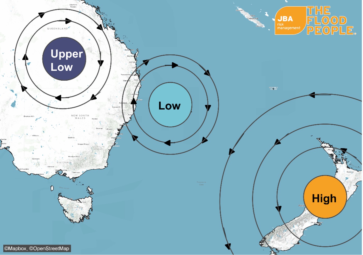 Figure 1. Simplified diagram showing the location of the East Coast Low (pale blue) in context with the (1) ‘blocking’ area of high pressure over New Zealand (orange) and (2) upper-level area of low pressure (dark blue) that both exacerbated rainfall over eastern Australia. Arrows denote direction of wind flow around the areas of low and high pressure. Further information can be found at: AskBOM: What is an East Coast Low?