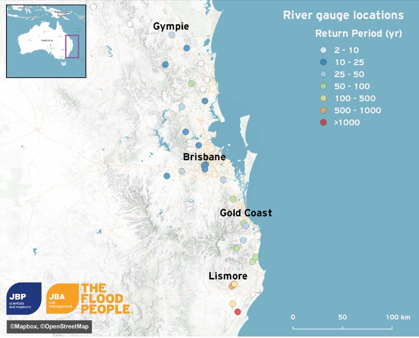 Figure 4: Estimated return periods from peak river levels measured between 23 February – 1 March 2022 and historical records at river gauges in Queensland and New South Wales. Data from Bureau of Meteorology Commonwealth of Australia (2022a). Data analysis conducted by JBP; maps produced by JBA Risk Management.