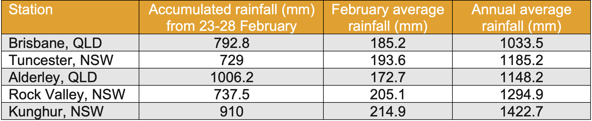 Table 1: Accumulated rainfall (in mm) between 23 and 28 February 2022, in context with the monthly and annual average rainfall, from observation stations across Queensland (QLD) and New South Wales (NSW). Data Source: Bureau of Meteorology Commonwealth of Australia (2022b).
