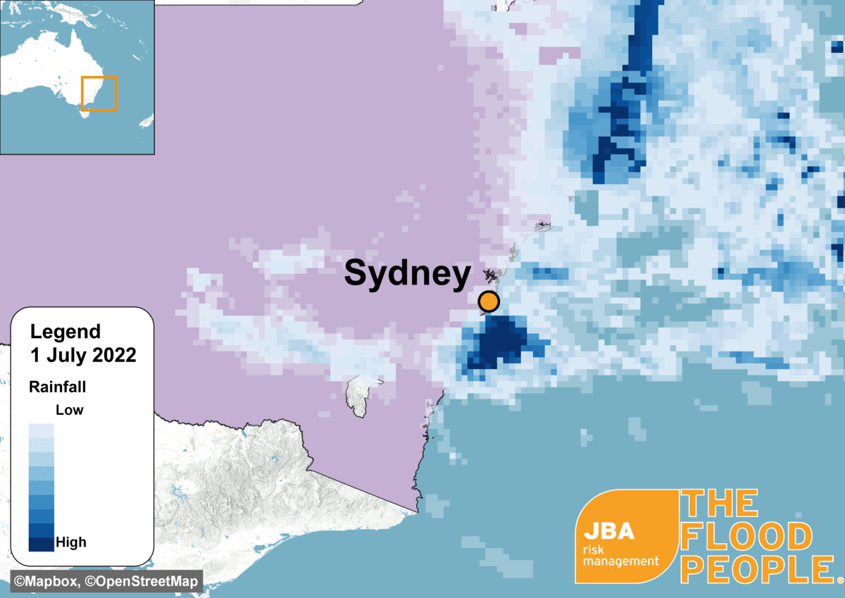 Figure 1: Satellite-observed rainfall animation over Sydney, Australia from 1 July to 7 July 2022. Data source NASA GPM, 2022 (video produced by JBA Risk Management, 2022).