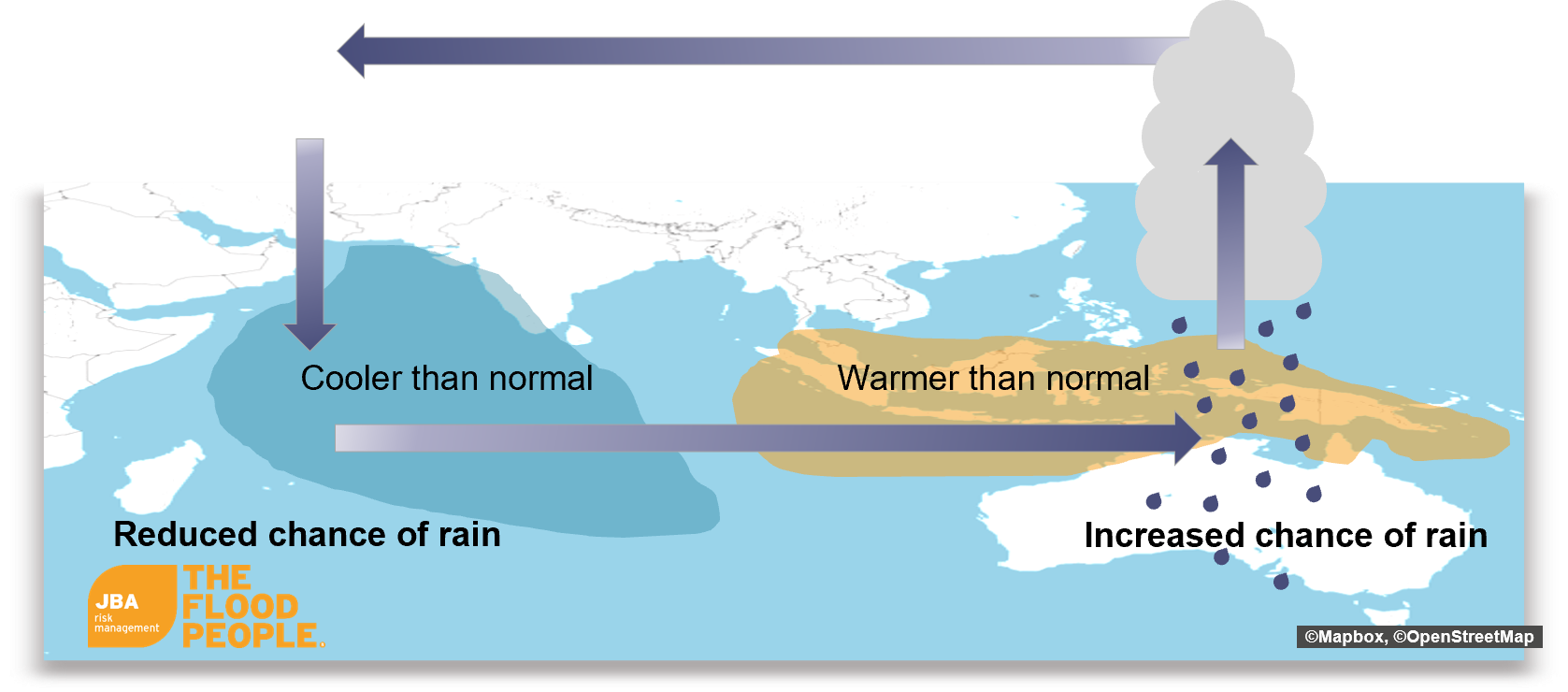 Figure 2: Diagram showing the negative phase of the Indian Ocean Dipole (JBA Risk Management, 2022).
