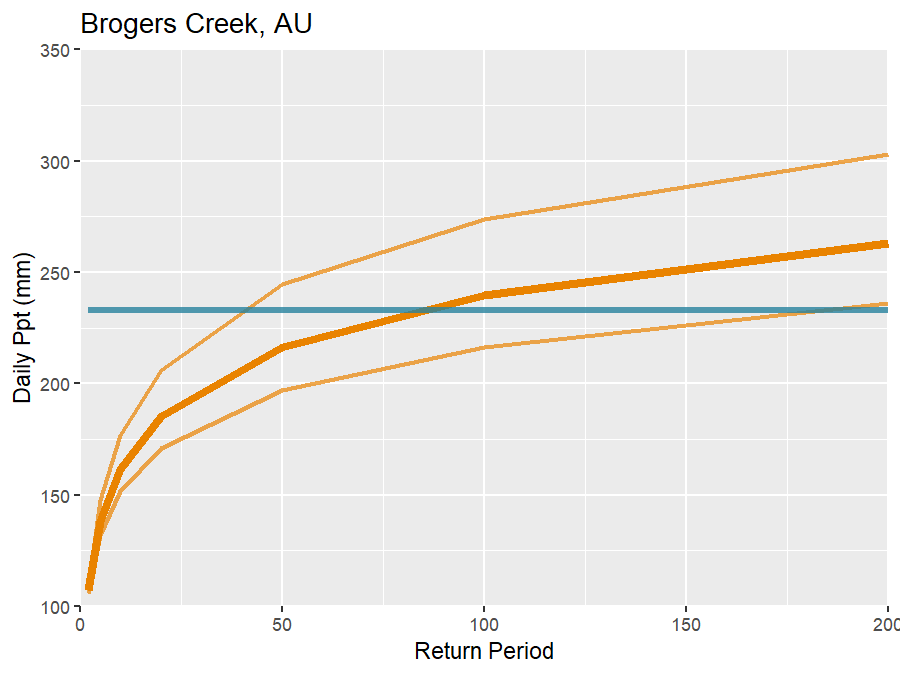 Figure 3: Rainfall return period analysis conducted by JBA Risk Management for Brogers Creek, Illawarra, Australia. Daily precipitation (mm) is shown on the y-axis and Return Period (years) is shown on the x-axis. The blue line represents the observed rainfall data at this site. Historical rainfall data was fitted with an exponential distribution curve. Data was extracted from CPC Global Unified Gauge-Based Analysis of Daily Precipitation (Physical Science Laboratory (NOAA), 2022).
