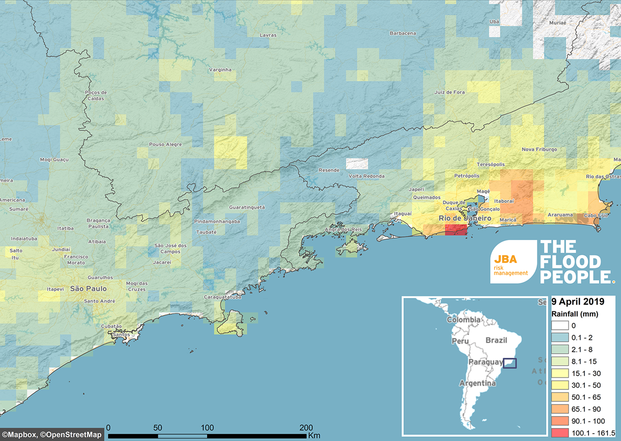 Two months’ worth of rainfall fell within nine hours to cause flooding across the city of Rio de Janeiro on 8 April 2019. During the downpour, the 24-hour rainfall total at Rio de Janeiro exceeded 340mm (Fonseca and Gaier, 2019). To put this into context, the average rainfall for the city in April is ~95mm (Watchers News, 2019). Copacabana Fort received 246mm of rain within nine hours, which represented two-and-a-half times April’s average rainfall total (Watchers News, 2019).
