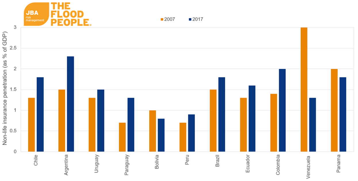 Brazil has been one of the fastest emerging markets, with non-life insurance penetration growing from 1.5% of GDP in 2007 to 1.8% in 2017 (Swiss Re Explorer, 2019). Compared to more established markets, however, penetration remains low in Latin American countries. Hence, public and private funds are utilised and relied on to cover losses and costs for rebuilding and recovery (World Bank, 2014).